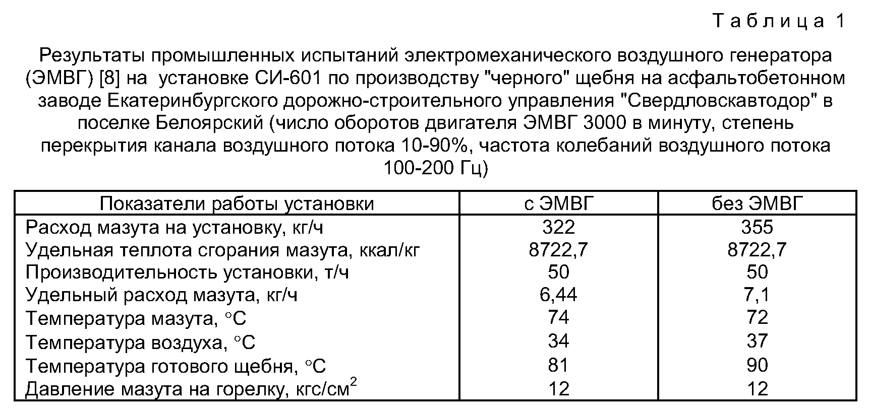 Результаты промышленных испытаний приведены в таблице 1, из которой следует, что применение ЭМВГ позволяет на 9,3% снизить удельный расход мазута при приготовлении асфальтобетона.
