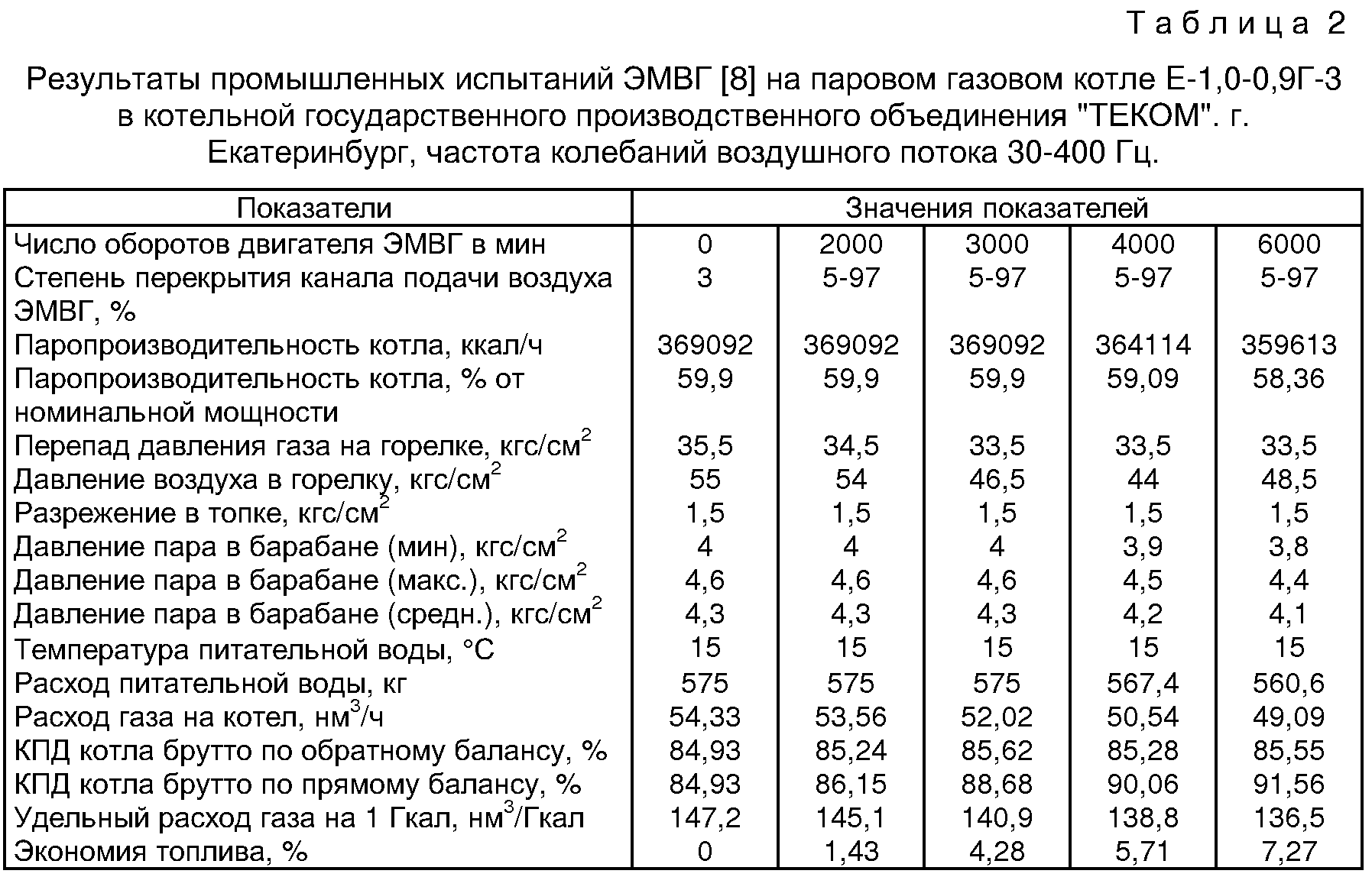 Результаты испытаний сведены в таблицу 2. Как видно из таблицы, с увеличением частоты вращения ЭМВГ с 2000 до 6000 оборотов в минуту удельный расход газа на выработку 1 Гкал тепловой энергии снижается на 1,43-7,27%.