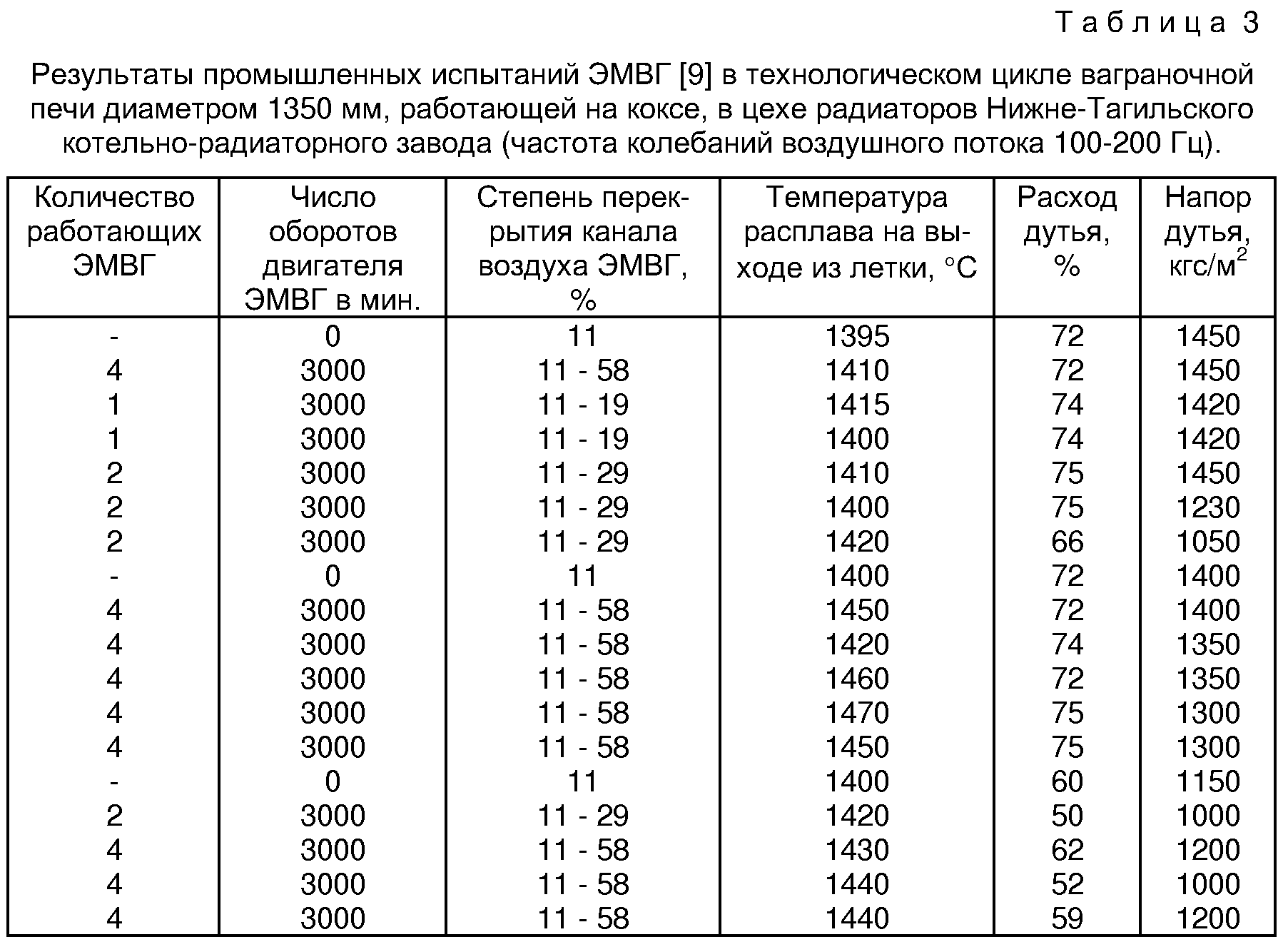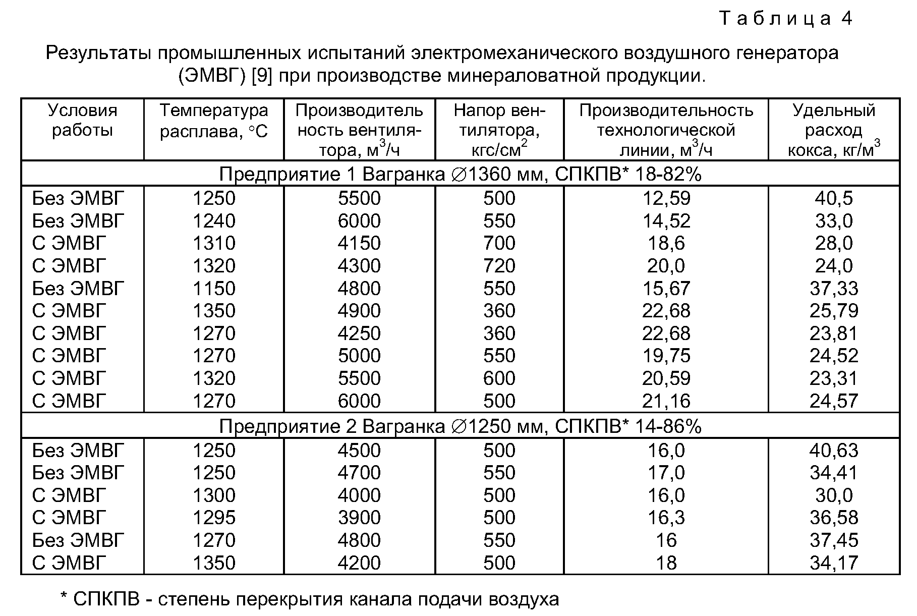 Пример 4. Проводились промышленные испытания по включению ЭМВГ в технологический цикл минераловатного производства. В качестве ЭМВГ применялось устройство, приведенное в примере 3. Согласно схеме, фиг.4, воздух вентилятором 5 по воздуховоду 3 через шибер 9 подается сначала на ЭМВГ 4, а затем в ваграночную печь 16. Результаты испытаний приведены в таблице 4.
