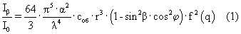 где I0 I – интенсивность света соответственно падающего и рассеянного под углом относительно падающего; соб – объемная концентрация частиц; r – радиус частицы, нм; – параметр, характеризующий отклонение свойств частицы от свойств среды; nч, nср – показатели преломления частиц и среды соответственно; – длина световой волны, нм; – угол между направлением электрического вектора в падающей волне и проекцией направления рассеяния на плоскость, перпендикулярную направлению распространения падающей волны.