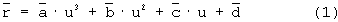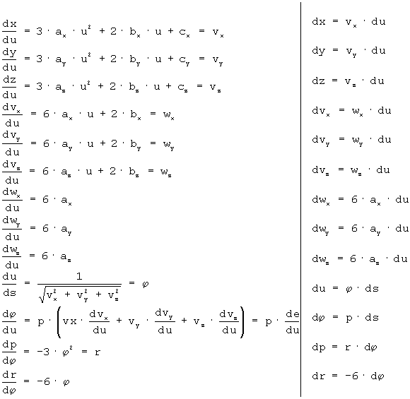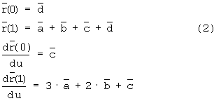 Для определения сегмента требуется четыре вектора (или 12 коэффициентов). Обычно для определения векторных коэффициентов , , и задают значения и на обоих концах сегмента. Концы сегмента отвечают значениям параметра u=0 и u=1, а между конечными точками сегмента 0 < и < 1. Определяют векторные коэффициенты , , и путем решения следующей системы уравнений: