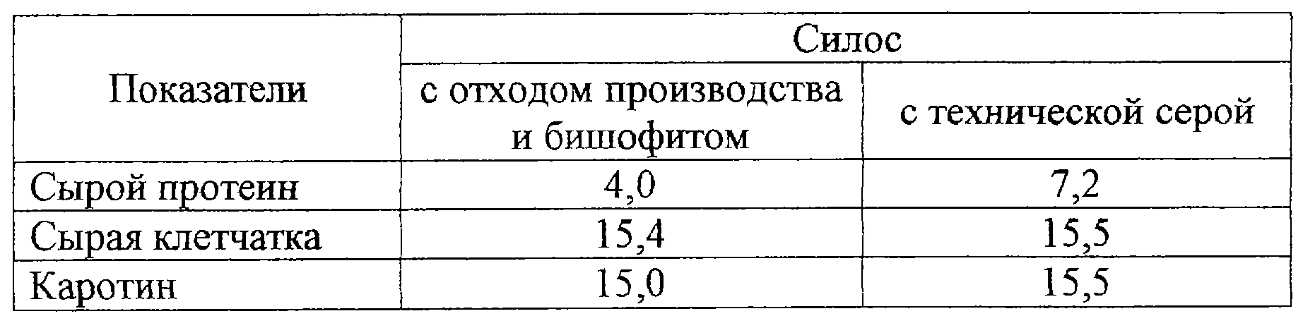 Таким образом, предложенный способ позволяет использовать недорогой, доступный консервант – серу гранулированную, отход производства установок сероочистки нефтепродуктов, и бишофит порошкообразный, обеспечить получение качественного силоса, обогащенного магнием, наибольшую сохранность питательных веществ.