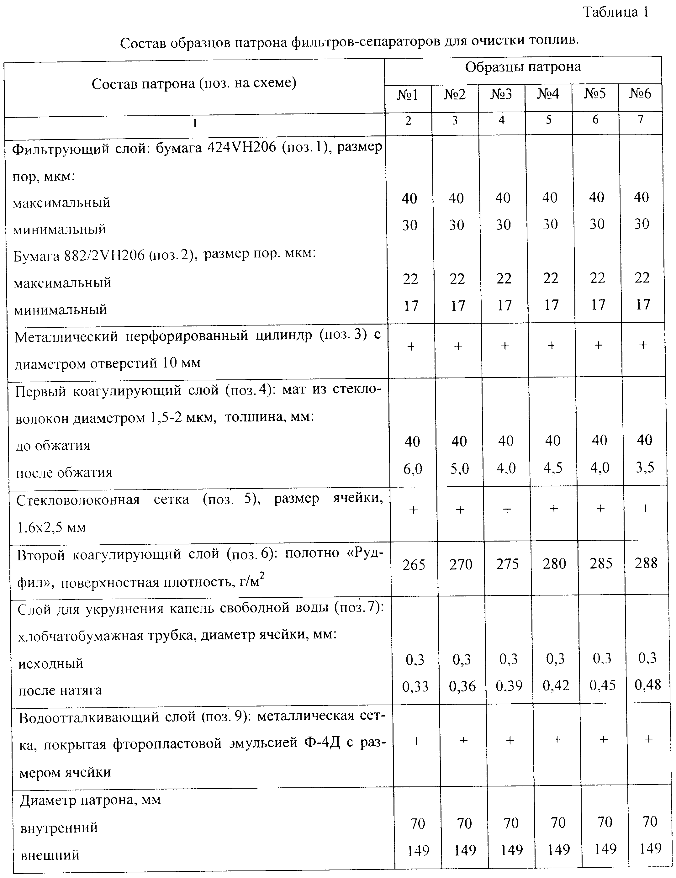 Предлагаемая конструкция патрона прошла испытания при очистке реактивных топлив ТС-1, РТ (ГОСТ 10227-86 “Топлива для реактивных двигателей. Технические условия”) и Т-6, Т-8В (ГОСТ 12308-89 “Топлива термостабильные Т-6 и Т-8В для реактивных двигателей. Технические условия), искусственно загрязненных и обводненных. Образцы патрона фильтра-сепаратора представлены в таблице 1.