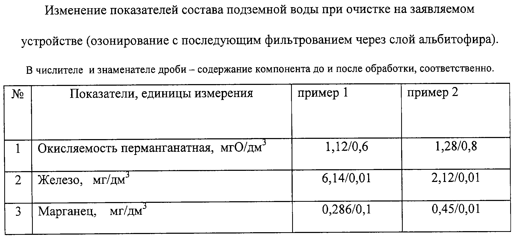 Пример 2. В установку подавалась подземная вода из скважины с содержанием ионов двухвалентного железа 2,12 мг/дм3. Давление в трубопроводе циркуляционного контура составляло 1,8 атм. Диаметр дисков кавитатора был равен 560 мм. Время обработки воды составляло 16 мин. Была достигнута концентрация озона в воде, равная 1,5%. Результаты, иллюстрирующие высокую эффективность очистки воды озонированием, приведены в таблице.