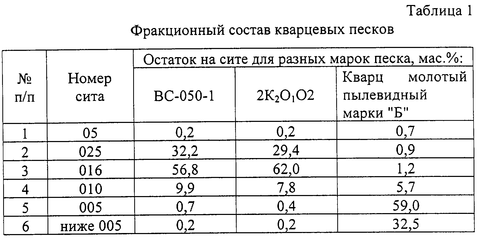 Необходимость использования полидисперсной смеси песков в качестве диоксида кремния в таком соотношении отвечает требованиям обеспечения заданной плотности, однородной структуры и стабильности свойств конечного продукта.