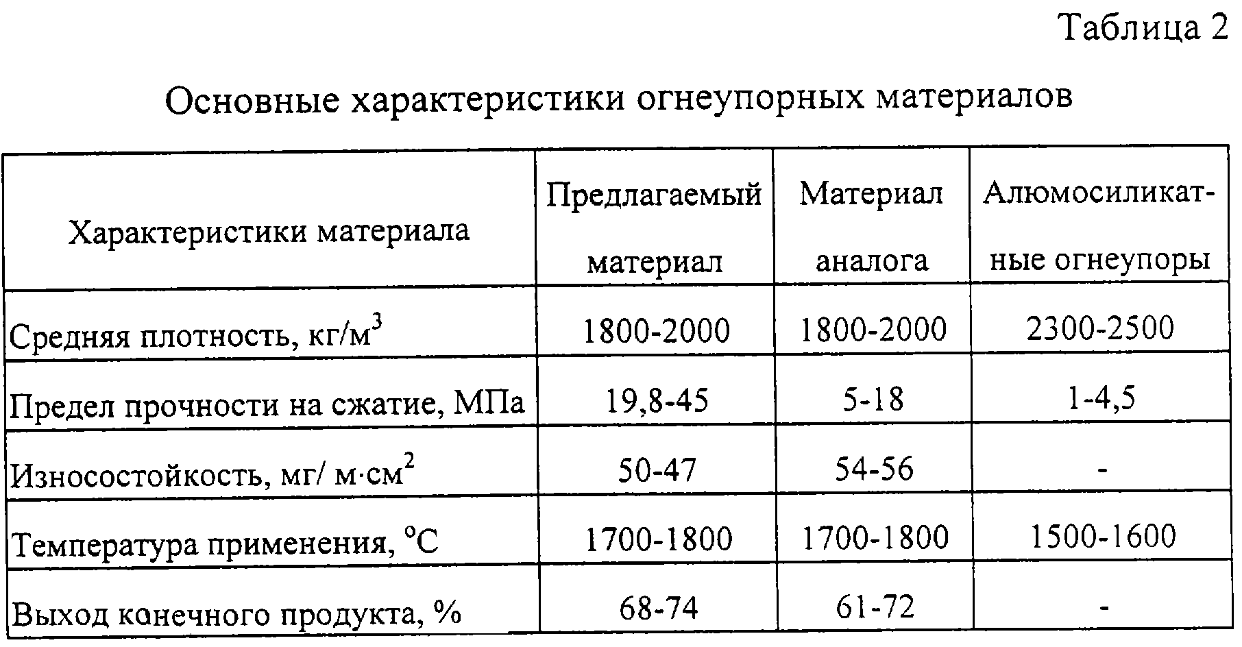 Опытным путем установлено, что приведенные выше составы имеют близкие между собой физико-механические и эксплуатационные характеристики, не уступающие стандартным алюмосиликатным огнеупорам с содержанием Аl2О3 не выше 35% и материалу-прототипу. Ниже приведена сравнительная таблица характеристик огнеупорных материалов (см. табл.2).