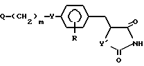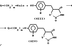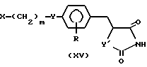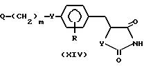 (57) Реферат: Описывается промежуточное соединение для получения гетероциклических соединений общей формулы XIV, где Y – атом кислорода; Y1 – атом серы; R – атом водорода; m – целое число от 1 до 5; Q – низшая алкоксикарбонильная группа, формильная группа, защищенная формильная группа или карбоксильная группа, обладающих гипогликемической и противодиабетической активностями.