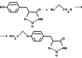 Примеры получения гетероциклических соединений, обладающих антидиабетической активностью, из предложенных промежуточных соединений:Пример А. 5-{4-(1H-Имидазо[4,5-b]пиридин-2-илметокси)бензил}тиазолидин- 2,4-дион К 200 мг 2,3-диаминопиридина добавляют 1,13 г соединения примера 1, и полученную смесь перемешивают при 110oC в течение 2 дней. После этого реакционную смесь обрабатывают 3н. водной хлористоводородной кислотой и затем подщелачивают путем добавления водного раствора аммиака. Водную смесь упаривают досуха при пониженном давлении, и затем остаток очищают путем колоночной хроматографии через силикагель, используя градиентный метод элюирования со смесями этилацетата и этанола в отношении 1:0 до 10:1 по объему в качестве элюента. Продукт выкристаллизовывают растиранием с этилацетатом, получая 400 мг указанного в заголовке соединения, плавящегося при 247-248oC. Пример Б 5-{ 4-(3-Метил-6-трифторметилимидазо[5,4-b] пиридин-2-илметокси) бензил} тиазолидин-2,4-дион К раствору 3,00 г 3-амино-2-метиламино-5-трифторметилпиридина в смеси 6 мл этанола и 6 мл уксусной кислоты добавляют 4,16 г соединения примера 3, и полученную смесь перемешивают при комнатной температуре 4 часа. После этого реакционную смесь освобождают от растворителя путем перегонки при пониженном давлении. К остатку добавляют 50 мл 1,2-диметоксиэтана и 5,2 г иода, и полученную смесь перемешивают при 60oC в течение одного дня. После этого реакционную смесь вливают в воду, затем экстрагируют этилацетатом. Экстракт промывают водным раствором хлорида натрия и высушивают над безводным сульфатом натрия, после чего растворитель удаляют путем отгонки при пониженном давлении. Остаток очищают путем колоночной хроматографии на силикагеле, используя в качестве элюента смесь (1:1 по объему) гексана и этилацетата. Продукт выкристаллизовывают растиранием с этилацетатом, получая в результате 520 мг указанного в заголовке соединения, плавящегося при 212-214oC. Пример В 5-{ 4-[2-(3-Метилимидазо[5,4-b] пиридин-2-ил)этокси]бензил} тиазолидин-2,4-дион Повторяют процедуру, описанную в примере Б, за исключением того, что используют 0,94 г 3-амино-2-метиламинопиридина, 2,10 г соединения примера 5,6 мл этанола, 3 мл уксусной кислоты, 2,32 г иода и 30 мл 1,2-диметоксиэтана. После обработки продукта так, как описано в примере Б, полученный неочищенный продукт очищают колоночной хроматографией на силикагеле, используя в качестве элюента этилацетат, и в результате получают 85 мг указанного в заголовке соединения, плавящегося при 96-100oC. Формула изобретения