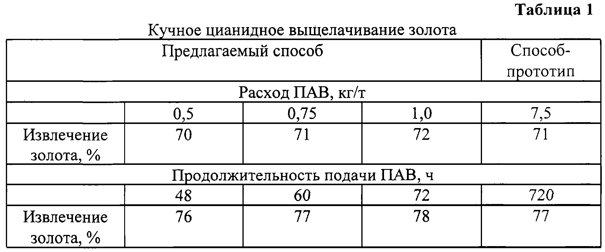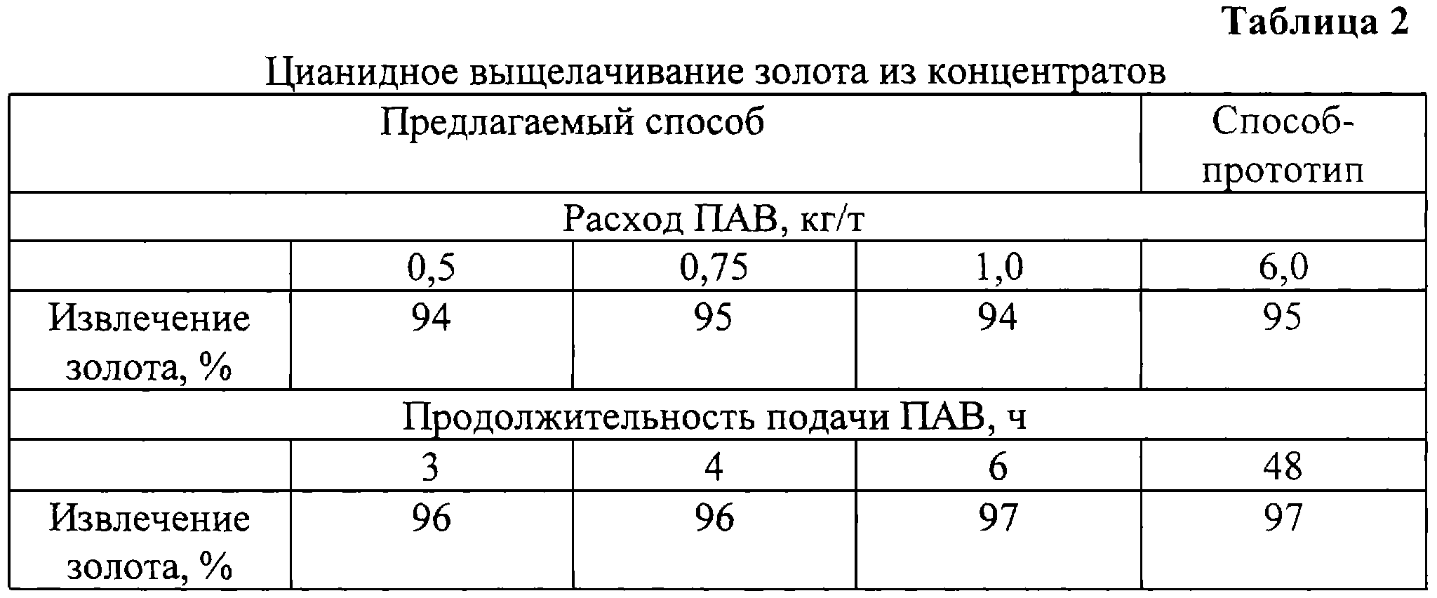 Выщелачивание золота проводили при механическом перемешивании и соотношении фаз Т:Ж=1:2. Защитное значение рН в пульпе 10-11 создавали введением известкового молока с содержанием СаО=150 г/л. Концентрацию цианида поддерживали на уровне 1 г/л введением в пульпу расчетного количества раствора цианистого натрия. Расход ПАВ составлял 0,5 кг/т при времени 6 ч. Параллельно процесс проводили по способу-прототипу. Результаты представлены в табл.2.