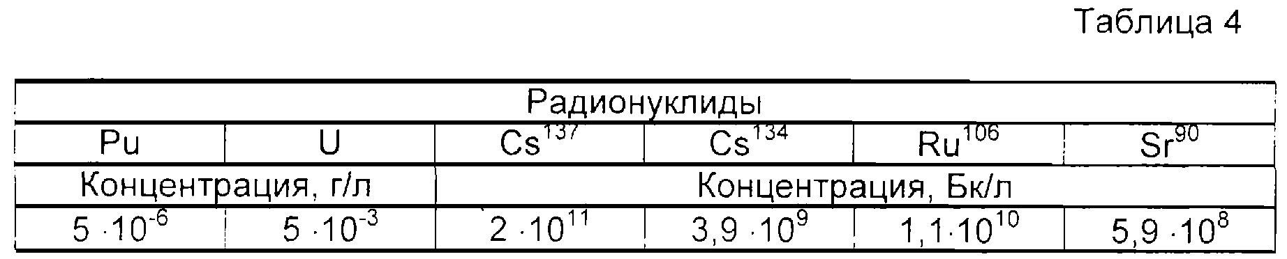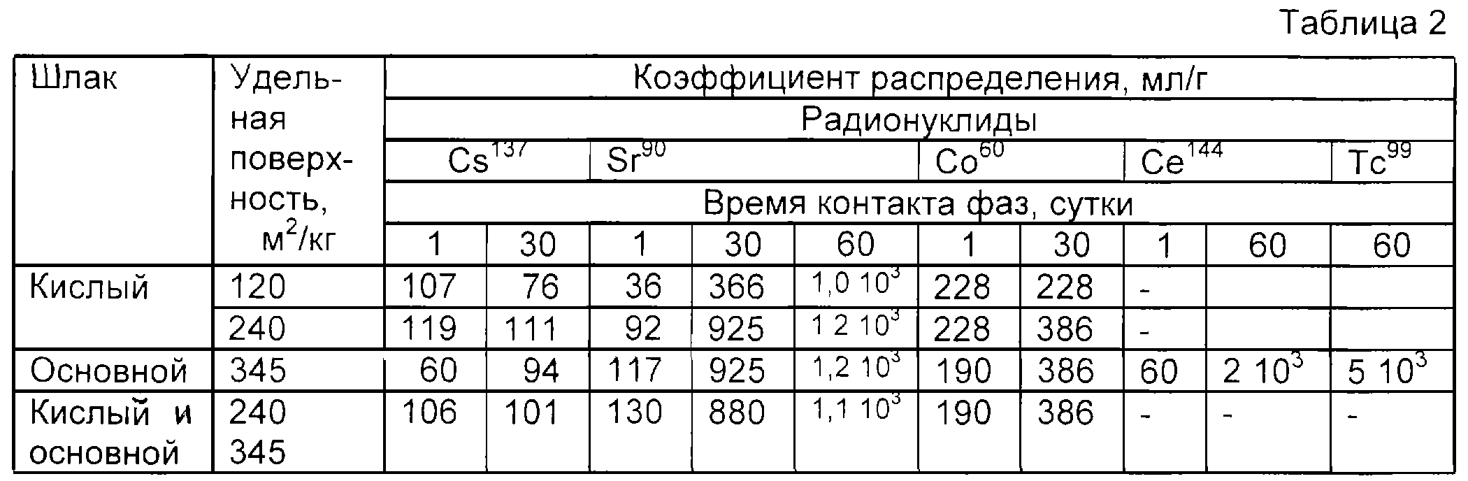 Кислый доменный гранулированный шлак измельчают до удельной поверхности 120 и 240 м2/кг, а основной – до 345 м2/кг. В водную фазу имитаторов ЖРО (объемом 300 мл), содержащих отдельно радионуклиды (Cs137, Sr90, Co60, Се144, Тс99), высыпают по 50 г сорбента – измельченного шлака. Сорбент перемешивают в течение 5 минут и оставляют под водной фазой на несколько месяцев. Исходная концентрация Cs137 в имитаторе составила 5,2·105 Бк/л, Sr90 2,2·105 Бк/л, Со60 1,8·105 Бк/л, Се144 4,4·105 Бк/л, Тс99 3,9 мг/л.