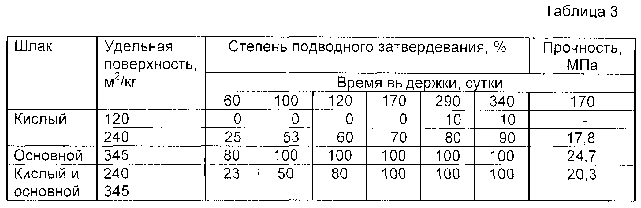 Результаты определений степени подводного затвердевания и прочности измельченных доменных гранулированных шлаков от времени выдержки представлены в табл.3.