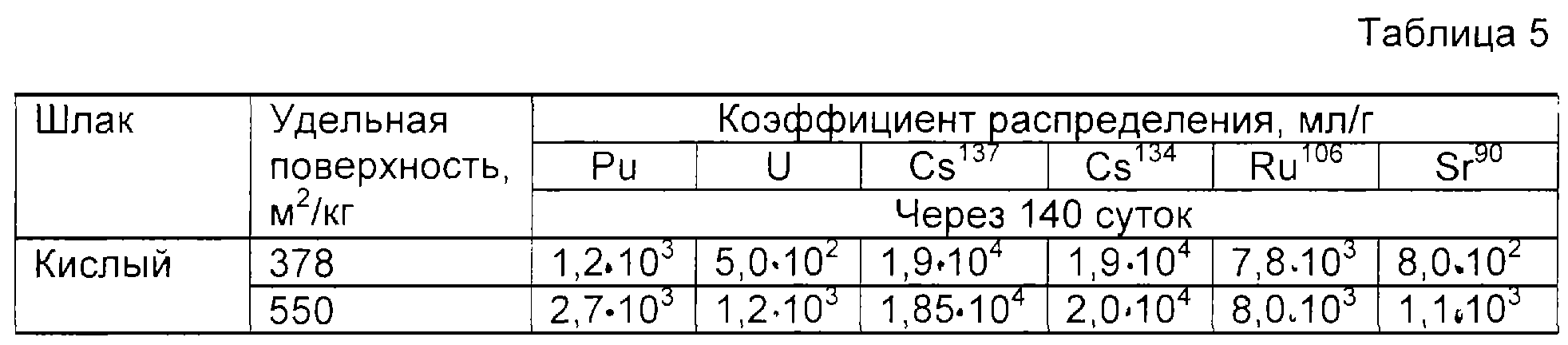 Как видно из данных табл.5, измельченный до удельной поверхности 378 и 550 м2/кг кислый шлак сорбирует радионуклиды из их смеси в водной фазе с коэффициентами распределения от 5·102 до 2·104 Причем коэффициенты распределения Pu, Ru106, Cs137 и Cs134 для измельченного до удельной поверхности 378 и 550 м2/кг кислого шлака практически одинаковы. После подводной выдержки в течение 140 суток измельченные до удельной поверхности 378 и 550 м2/кг кислые доменные гранулированные шлаки достигают прочности в 11,3 МПа и 17,5 МПа соответственно.