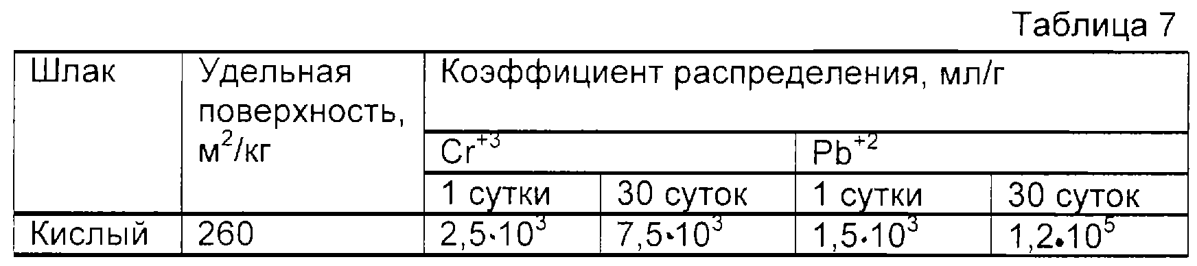 Кислый доменный гранулированный шлак измельчают до удельной поверхности 260 м2/кг. В водный раствор имитаторов (объемом 300 мл), отдельно содержащих токсичные элементы Cr+3 и Рb+2 (в виде нитратов), вносят по 50 г сорбента – измельченного кислого шлака. Сорбент перемешивают в течение 5 минут и оставляют под водной фазой на несколько месяцев. Исходная концентрация Сr+3 в водной фазе составляла 270 мг/л, а Рb+2 – 76 мг/л. Результаты определений коэффициентов распределения токсичных элементов Сr+3 и Рb+2 при сорбции кислым шлаком представлены в табл.7.