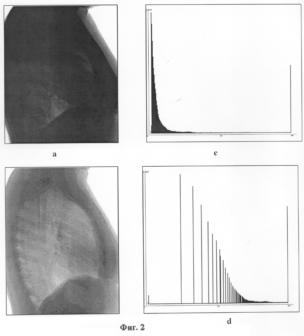 Эффективность предложенного способа проиллюстрируем на примере обработки рентгеновского изображения грудной полости в боковой проекции пациентки Л. 28 лет, проходившей профилактическое обследование на цифровом флюорографе. Боковой рентгеновский снимок выполнен в тех же энергетических режимах, что и прямой: U=80кВ, q=20 мАс, t=0,05 с. На фиг.2 представлены изображения до (a) и после (b) обработки и соответствующие этим изображениям гистограммы яркостей (с, d), полученные при следующих параметрах алгоритма: R0=0, R1=128. С помощью данного алгоритма за короткое время (измеряемое долями секунды) удается автоматически привести зарегистрированное изображение к виду, позволяющему врачу-рентгенологу определить наличие или отсутствие патологических изменений. У пациентки Л. отклонения от нормы не обнаружено. Использование предложенного нами способа двухпроекционной рентгенографии позволило в рассмотренном случае снизить дозовую нагрузку на обследуемого примерно в 1,5 раза.