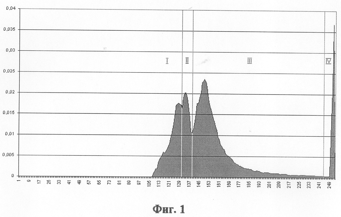 Анализ большого количества обработанных и доведенных до хорошего диагностического качества изображений как прямой, так и боковых проекций грудной полости, полученных на различных типах цифровых рентгенографических систем, показал, что на усредненной по множеству изображений гистограмме яркостей (эталонной гистограмме) можно выделить четыре области с выраженными пиками (фиг.1):