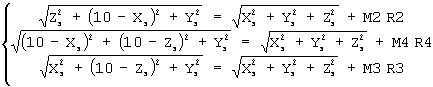 Учитывая, что исходные координаты микрофонов (координаты точек M1, М2, М3 и М4) известны исходя из расстояния между микрофонами, расстояния М2 R2, М4 R4 и М3 R3 вычисляются из результатов измерений, получается система из трех уравнений с тремя неизвестными – Хз, Yз и Zз, решая которую мы определяем локализацию в пространстве источника звука З.