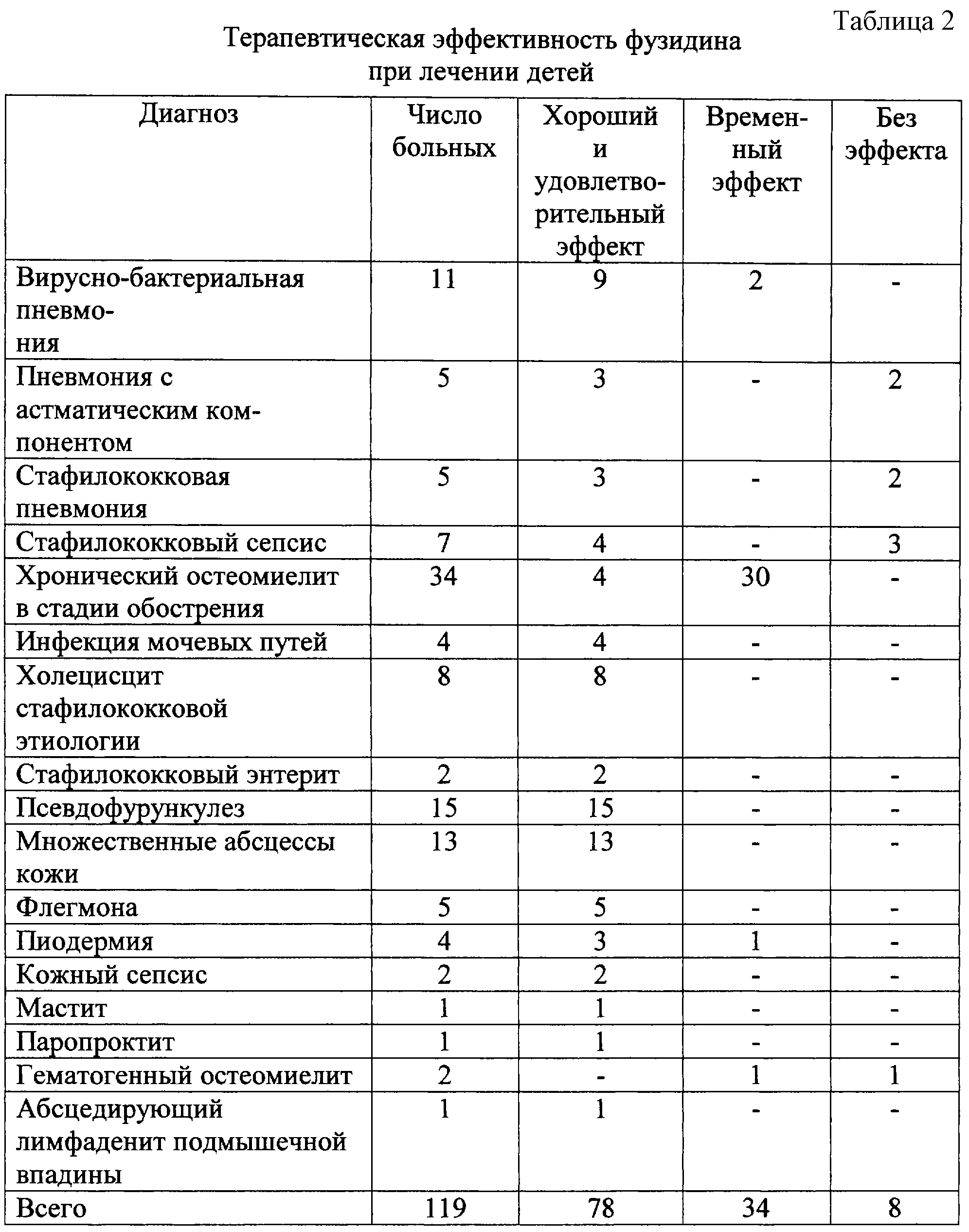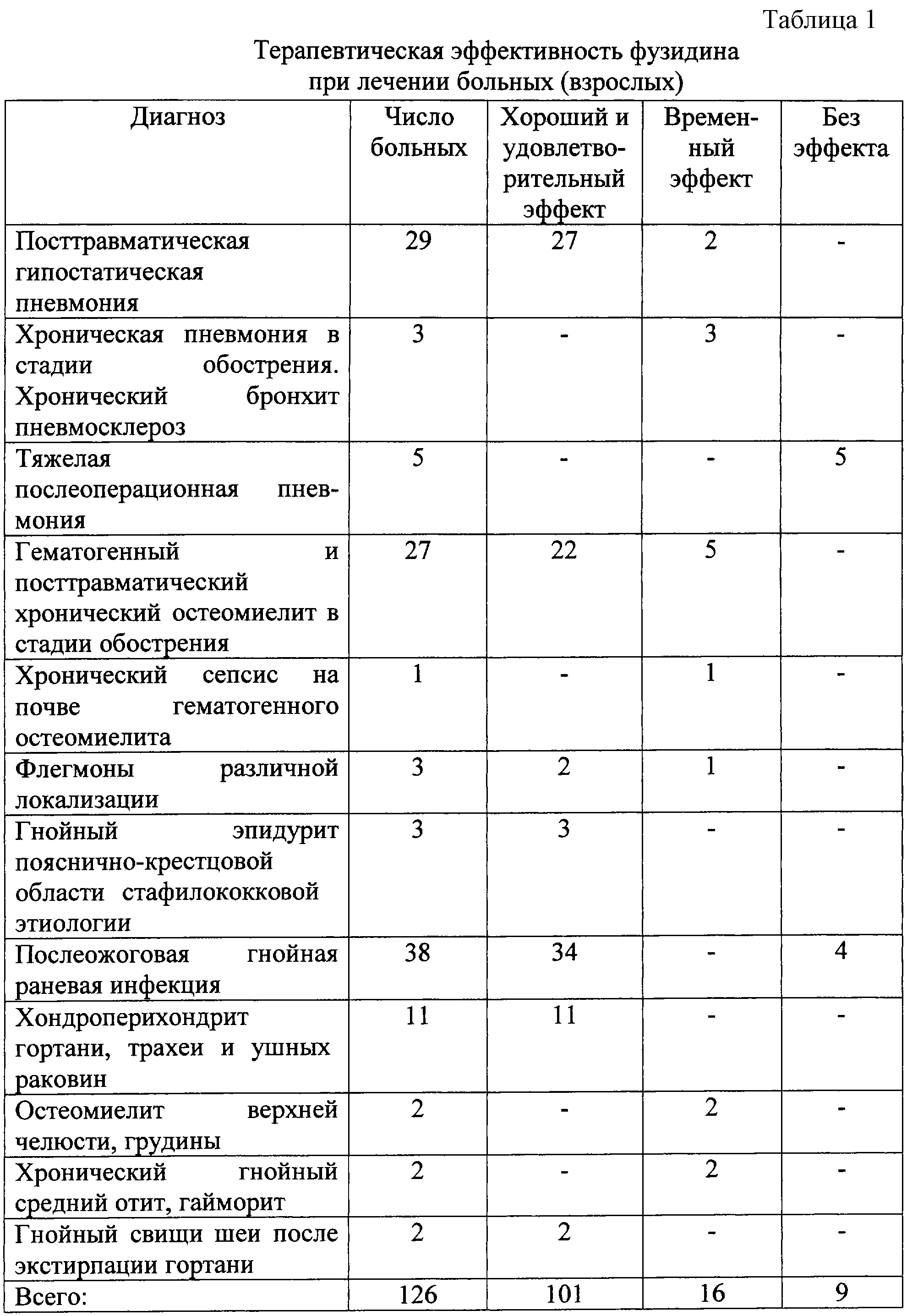 Фузидин применяли при лечении инфекций дыхательных путей и легких (бронхитов, острых и хронических пневмоний), сепсиса, послеоперационной раневой инфекции, острого и хронического остеомиелита, заболеваний мочевыводящих путей и др. Обобщенные данные об эффективности фузидина представлены в табл.1 и 2.