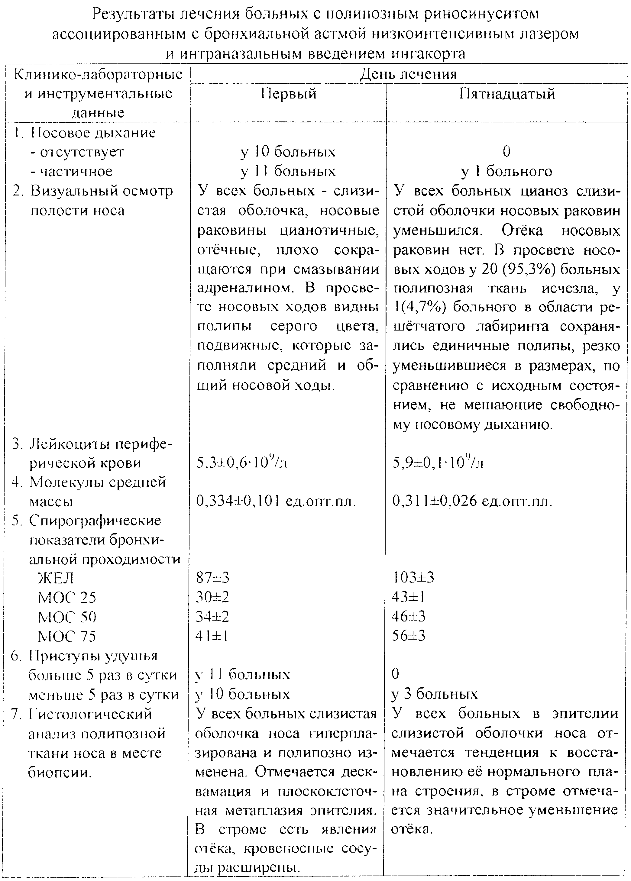 (57) Реферат: Изобретение относится к медицине, а именно к пульмонологии и отоларингологии, и может быть использовано для лечения полипозного риносинусита у больных с бронхиальной астмой. Разработан способ лечения полипозного риносинусита у больных бронхиальной астмой. Способ заключается в устранении полипозной ткани и лечении основного заболевания глюкокортикостероидными препаратами. В нем используют низкоинтенсивное лазерное облучение с длиной волны 630 нм и мощностью 50 мВт/см2. Наружно-накожное: переносица носа 1 мин, в центре спинки носа 20 с. При этом в точке fossa canina с обеих сторон по 1 мин; интраназальное – световод вводится поочередно в оба носовых хода на глубину 1 см. Экспозиция облучения 15 с. Облучение крови производится транскутанным надвенным способом, в области локтевой вены, экспозиция 15 мин. Курс лечения проводится ежедневно в течение 15 дней. Одновременно с курсом лазеротерапии больной получает интраназально аэрозольный ингакорт в дозе 250 мкг, во время вдоха, в каждый носовой ход, два раза в день. Способ позволяет устранить хирургическую травму слизистой оболочки полости носа и улучшить результаты лечения полипоза носа и бронхиальной астмы. 1 табл., 1 ил. Изобретение относится к медицине, а именно к пульмонологии и отоларингологии. Известный способ обладает рядом существенных недостатков: 1. Операционная травма полости носа пациента. 2. Хирургическое вмешательство часто является отправным моментом в рецидивировании полипов, что ведет к реоперации. Цель предложенного способа – устранение хирургической травмы слизистой оболочки полости носа и улучшение результатов лечения как полипоза носа, так и бронхиальной астмы. Поставленная цель достигается тем, что лечение полипов носа, сочетающихся с бронхиальной астмой, проводится путем применения низкоинтенсивной лазерной терапии через кровь и через нос, с интраназальным ингаляционным лечением кортикостероидным лекарственным препаратом – ингакортом. Способ осуществляют следующим образом. Низкоинтенсивное лазерное облучение производится гелий-неоновым лазером (установка ЛА-2). Длина волны излучения 630 нм, мощность излучения с дистального конца световода – 50 мВт/см2. Облучение носа осуществляется 1) наружно-накожное: переносица носа – 1 мин, в центре спинки носа 20 с, в точке fossa canina с обеих сторон по 1 мин, 2) интраназальное – световод вводится поочередно в оба носовых хода на глубину 1 см, экспозиция облучения 15 с. Облучение крови производится транскутанным надвенным способом в области локтевой вены, экспозиция – 15 мин. Курс лечения 15 сеансов. Дополнительно 2 раза в сутки больной интраназально получает ингаляционный кортикостероидный препарат – ингакорт, в разовой дозе 250 мкг, во время вдоха в каждый носовой ход. Ингакорт впервые применен нами по новому назначению. Ранее этот препарат применяли для ингаляции через ротовую полость и только для лечения бронхиальной астмы. Вышеприведенное лечение проводится на фоне традиционной схемы лечения бронхиальной астмы: назначением базисного препарата, 2–агонистов, бронходилататора, разжижающих и отхаркивающих мокроту лекарственных средств.