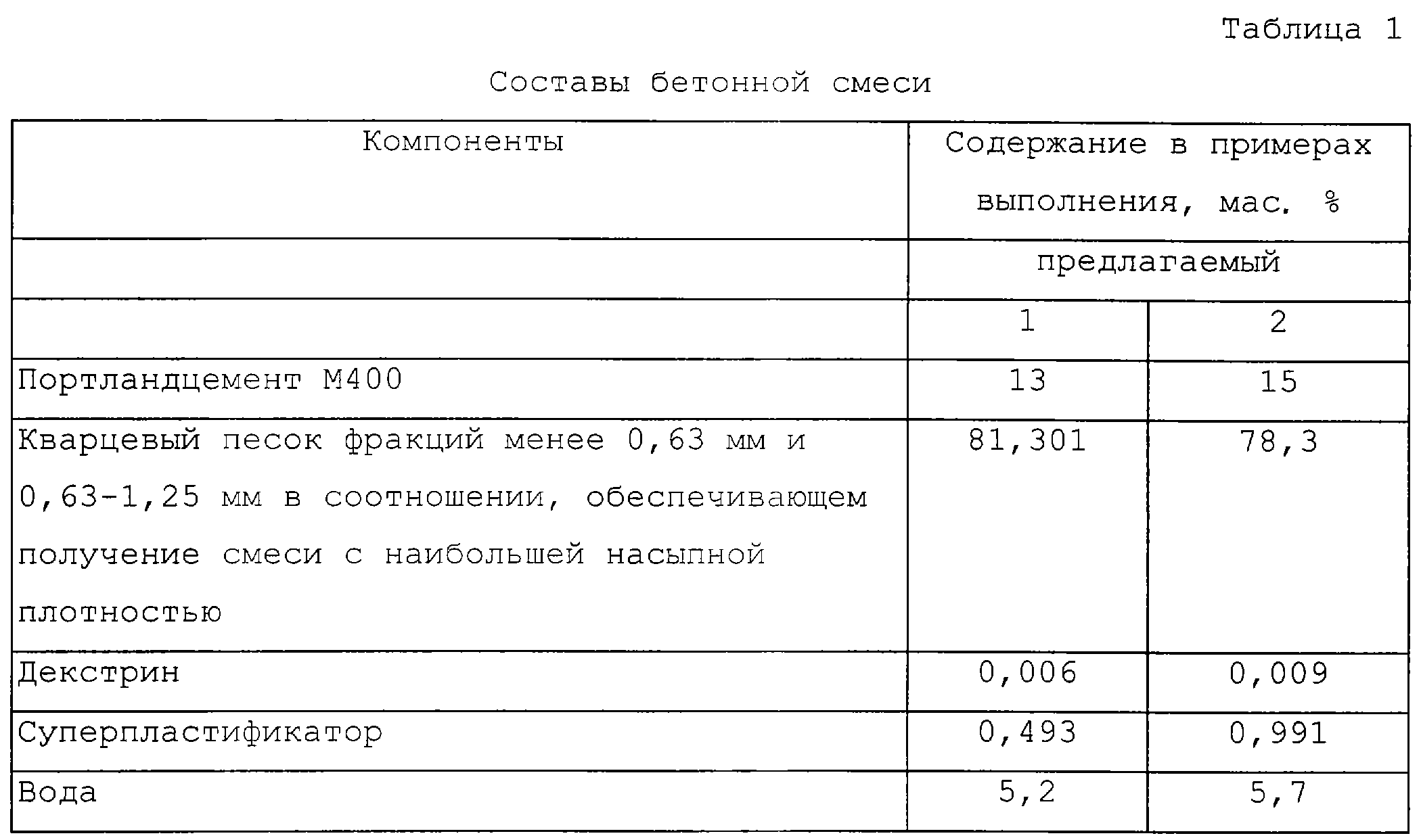 Формула изобретения Бетонная смесь, включающая портландцемент, кварцевый песок двух фракций и пластифицирующую добавку, содержащую суперпластификатор С-3, отличающаяся тем, что она содержит в качестве кварцевого песка кварцевый песок фракций менее 0,63 и 0,63-2,5 мм в соотношении, обеспечивающем получение смеси с наибольшей насыпной плотностью, в качестве портландцемента – портландцемент марки 400, а в пластифицирующую добавку дополнительно вводят декстрин при следующем соотношении компонентов, мас.%: Портландцемент марки 400 13-15 Указанный кварцевый песок 78,3-81,301 Декстрин 0,006-0,009 Суперпластификатор С-3 0,493-0,991 Вода 5,2-5,7 MM4A Досрочное прекращение действия патента Российской Федерации на изобретение из-за неуплаты в установленный срок пошлины за поддержание патента в силе