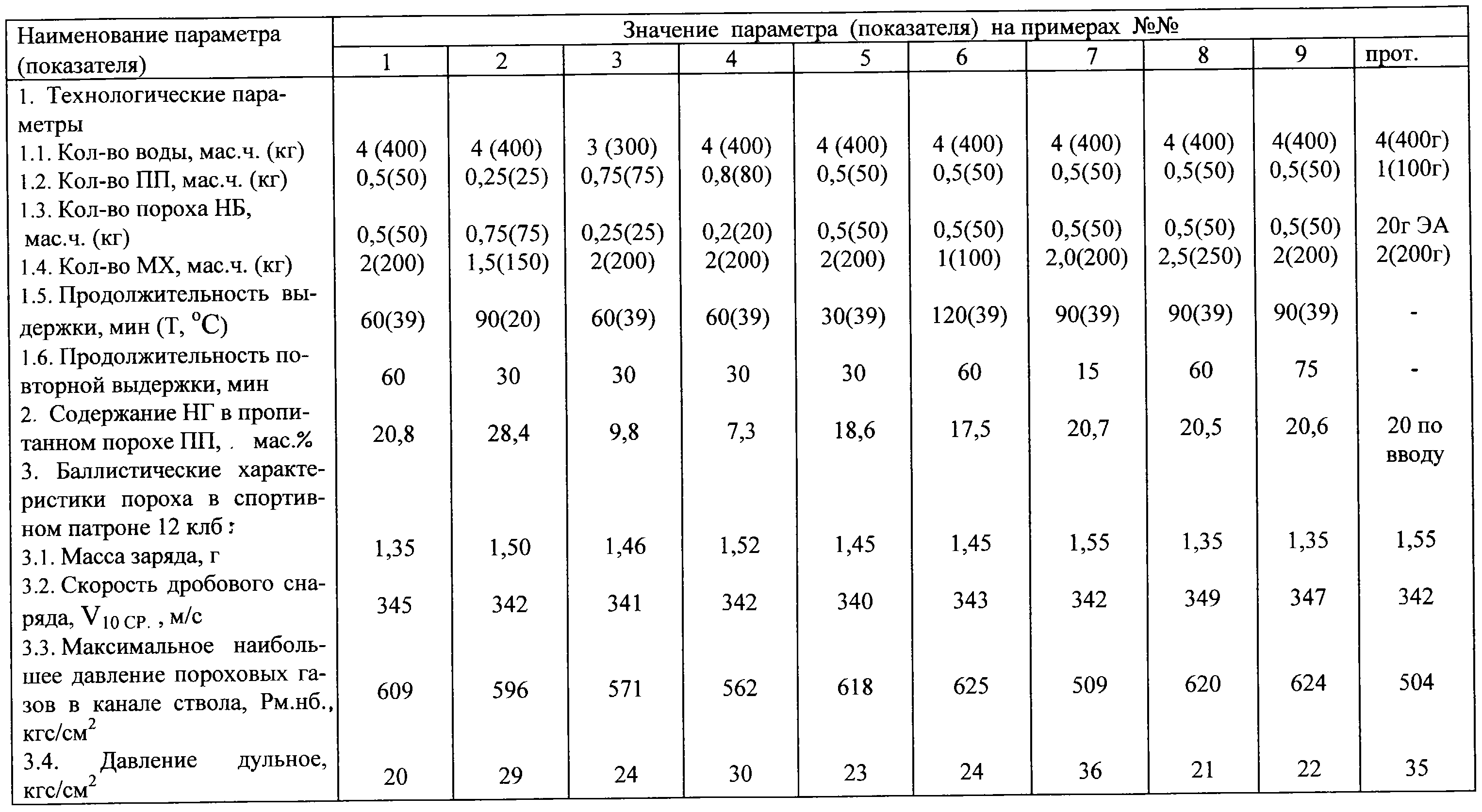 Опыты проводились в реакторе объемом 1500 л, снабженном рубашкой для обогрева, мешалкой и холодильником для конденсации отгоняемого растворителя. По завершении процесса нитроглицеринсодержащий ПП отделялся на ситах от отработанного баллиститного пороха, подвергался сушке, графитовке. Результаты физико-химического анализа и баллистических испытаний порохов в составе спортивного дробового патрона 12 клб. (масса дробового снаряда 24 г) приведены в таблице.