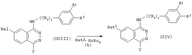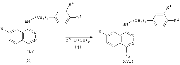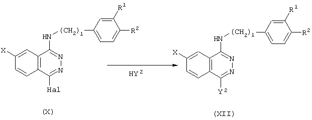 Это реакция, в которой соединение, представленное формулой (X), подвергается взаимодействию с HY2 в растворителе, давая соединение, представленное формулой (XII). В качестве реакционного растворителя предпочтителен N-метил-2-пирролидин, но может использоваться любой растворитель, инертный для данной реакции. Предпочтительные результаты могут быть получены при использовании HY2 в избыточном количестве относительно соединения (X) или при использовании органического основания, такого как диизопропилэтиламин, или соли, такой как карбонат калия, карбонат натрия или гидрокарбонат натрия. Температура реакции находится в интервале от комнатной до точки кипения растворителя, предпочтительно 100 С или более.