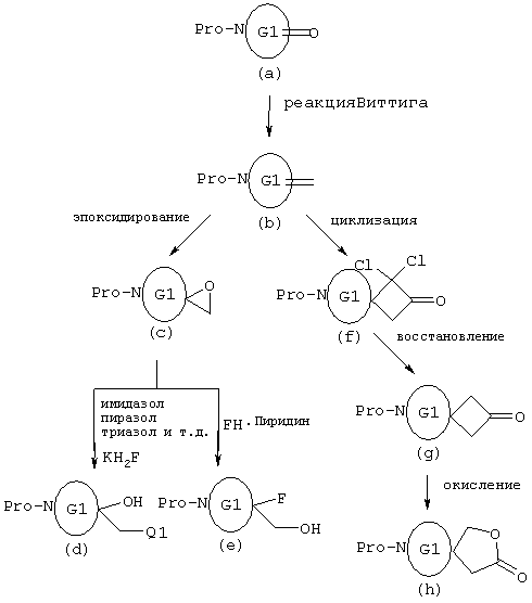 Соединение (b) подвергается взаимодействию с трихлорацетилхлоридом в растворителе, таком как диэтиловый эфир, диметоксиэтан или тетрагидрофуран, с получением дихлорциклобутанонового соединения (f). (Альтернативно, когда оно взаимодействует с диацетилхлоридом, получают монохлорпроизводное. Монохлорпроизводное также может быть получено взаимодействием с трихлорацетилхлоридом с последующей обработкой уксусной кислотой). И затем продукт подвергается обработке восстановителем, таким как порошкообразный цинк, в результате может быть получено циклобутаноновое соединение, представленное формулой (g). Температура реакции предпочтительно составляет от 10 до 50 С. Когда соединение (g) подвергается обработке пероксидом, таким как 3-хлорпербензойная кислота, в присутствии гидрокарбоната натрия в растворителе, таком как дихлорметан, может быть получено лактоновое соединение, представленное формулой (h). Температура реакции предпочтительно находится в интервале от комнатной температуры до 40 С. Когда соединение (b) подвергается обработке дихлоркетеном и диазометаном, получают циклопентаноновое соединение формулы (f), а когда соединение (g) подвергается обработке диазометаном, получают циклопентаноновое соединение формулы (g). Когда циклопентаноновое соединение дополнительно обрабатывается диазометаном, получают циклогексаноновое соединение.