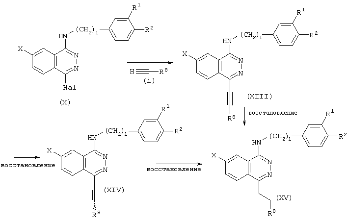 Реакцию соединения формулы (X) с алкиновым (ацетиленовым) соединением проводят в присутствии каталитического количества дихлорбистрифенилфосфинпалладия(II), йодида меди и третичного амина при комнатной температуре или при нагревании. Используемый растворитель включает диметилформамид или 1-метилпирролидинон. Используемый третичный амин включает триэтиламин, диизопропилэтиламин, DBU и диметиланилин.