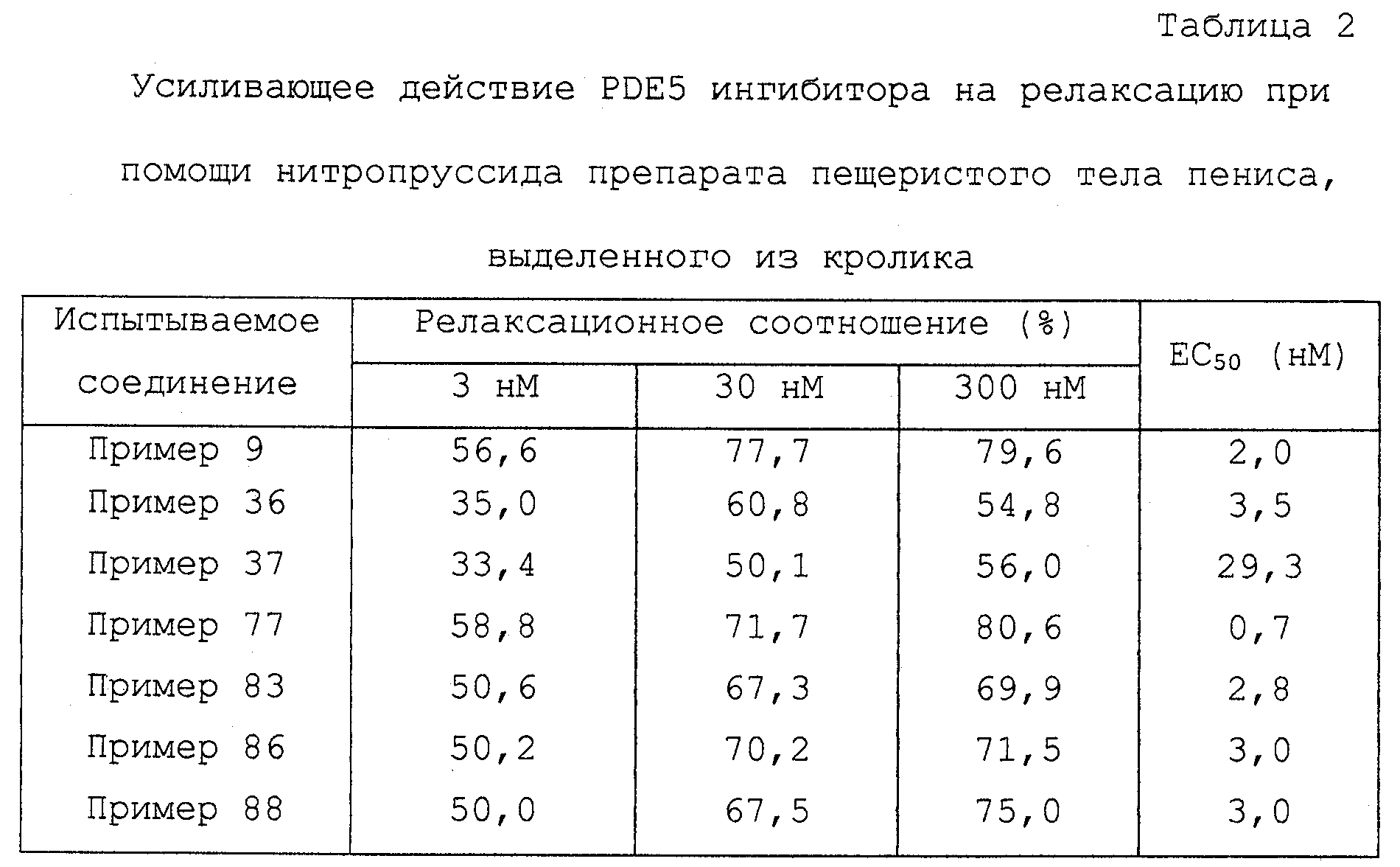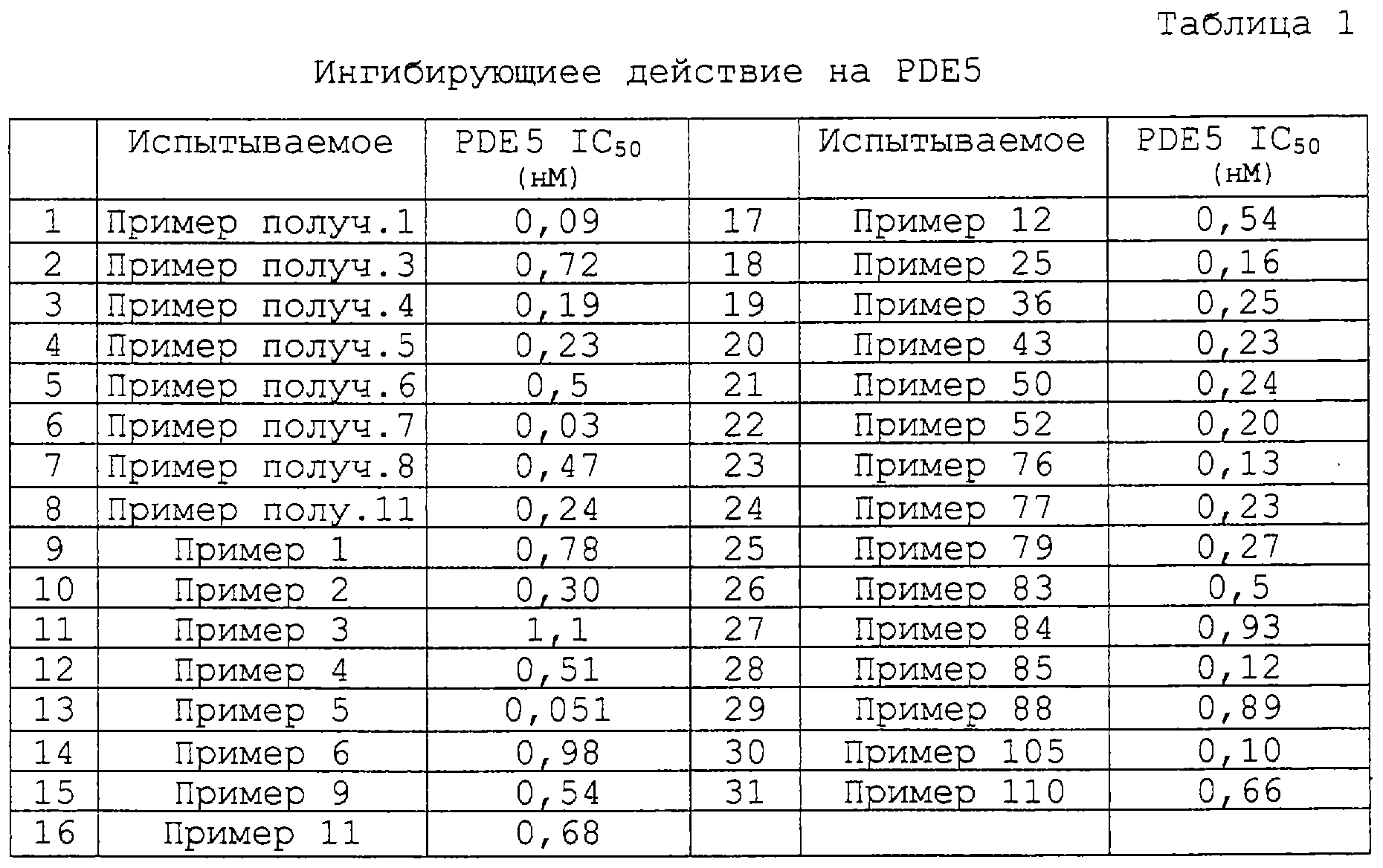 Ингибирующую активность испытываемого соединения на фермент cGMP-PDE, приготовленный из тромбоцитов свиньи, оценивают добавлением раствора испытываемого соединения в DMSO в реакционный раствор, где 1 мкМ cGMP используется в качестве субстрата, в присутствии 1 мМ EGTA в соответствии со способом Tompson et al. Конечная концентрация DMSO в реакционном растворе составляет 1% или менее. Получение cGMP-PDE осуществляют следующим образом. Тромбоциты свиньи добавляют в буфер А (20 мМ Tris/HCl, 2 мМ ацетат магния, 10 мМ 2-меркаптоэтанол, 0,1 мМ EGTA; рН 7,4) и подвергают обработке ультразвуком. Образующуюся суспензию центрифугируют при 100000