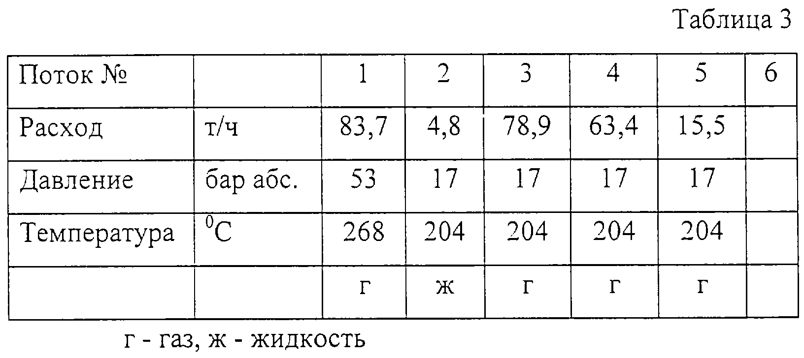 На фиг.3 приведен третий пример. Дросселирование происходит при противодавлении 17 бар абс. (см. данные по потокам в табл.3). Паровая турбина Т приводит в движение генератор G для выработки электрической энергии (например, 400 В) мощностью около 3,8 МВт. Большая часть насыщенного пара 3 подается в паровую сеть N (поток 4). Часть парового потока 5 используется в одном или нескольких инжекторах (I). В данном примере инжектированный пар используется для нагрева испарителя колонны К и одновременно поток, который вытекает из испарителя, охлаждается в присоединенном аппарате В. Конденсат при этом отводится с водой W, используемой в процессе.