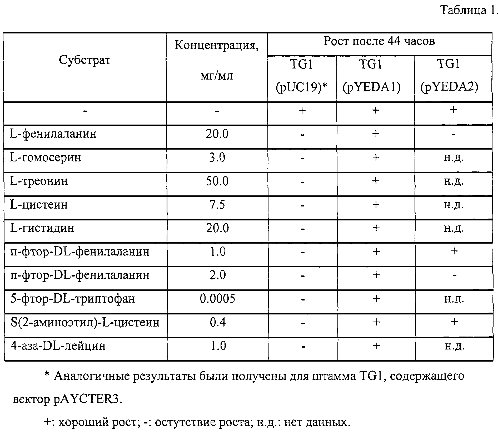 Затем была определена способность каждого из указанных штаммов расти в присутствии аминокислот и их аналогов на минимальной агаризованной среде М9 с глюкозой, содержащей ступенчато увеличивающиеся концентрации ингибиторов. Чашки были засеяны от 106 до 107 клеток ночной культуры, выращенной на минимальной среде, содержащей 100 мг/мл ампицилина в случае штаммов с плазмидами. Способность к росту определялась после 44 часов инкубации при 37 С. Результаты экспериментов представлены в таблице 1.