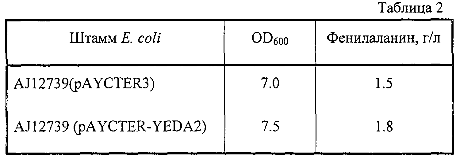 Как видно из таблицы 2, амплификация гена yedA увеличивает продукцию фенилаланина штаммом АJ12739.