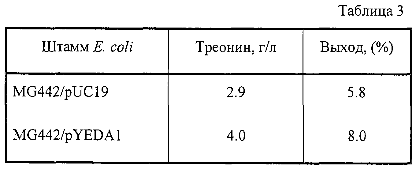 Как видно из таблицы 3, амплификация гена yedA увеличивает продукцию треонина штаммом MG442.