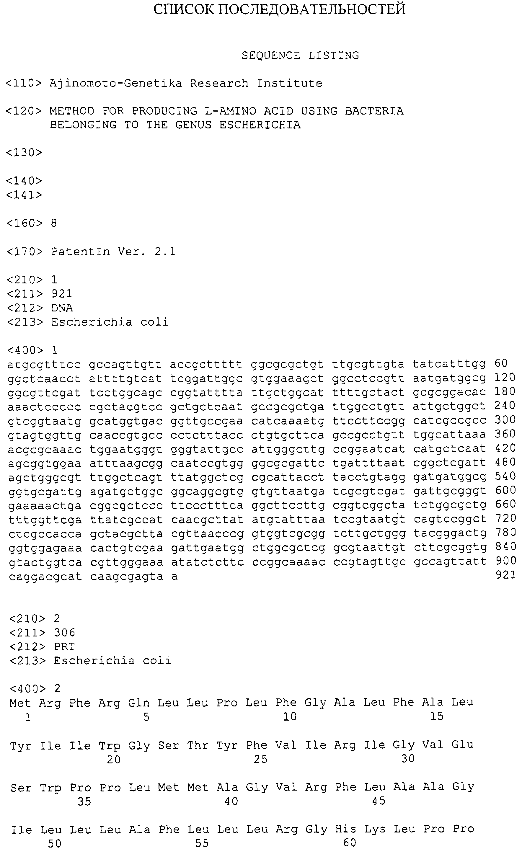 (57) Реферат: Изобретение относится к биотехнологии. L-аминокислоты, такие как L-фенилаланин или L-треонин, получают культивированием бактерии Escherichia coli с увеличенной способностью к продукции L-аминокислот. Затем аминокислоты выделяют из культуральной жидкости. Штаммы бактерии Escherichia coli AJ12739 (pAYCTER-YEDA2) и MG442/pYEDA1 обладают увеличенной способностью к продукции L-фенилаланина и L-треонина соответственно. Изобретение позволяет получать L-аминокислоты с высокой степенью эффективности. 3 с. и 4 з.п.ф-лы, 3 табл. Область техники Настоящее изобретение относится к биотехнологии, в частности к способу получения L-аминокислот методом ферментации, и, более конкретно, к гену, полученному из бактерии Escherichia coli. Указанный ген позволяет улучшить продукцию L-аминокислот, например L-фенилаланина и L-треонина. Предшествующий уровень техники Традиционно L-аминокислоты в промышленном масштабе могут быть получены методом ферментации с использованием штаммов микроорганизмов, полученных из природных источников, или их мутантов, специально модифицированных для того, чтобы увеличить продукцию L-аминокислот. Описано множество методов увеличения продукции L-аминокислот, например, путем трансформации микроорганизма рекомбинантной ДНК (см., например, патент США 4278765). Указанные методы основаны на повышении активности ферментов, вовлеченных в биосинтез аминокислот, и/или уменьшении чувствительности целевого фермента к обратному ингибированию продуцируемой L-аминокислотой (см., например, выложенную патентную заявку Японии № 56-18596 (1981), WO 95/16042 или патенты США 5661012 и 6040160). С другой стороны, повышенная экскреция L-аминокислот может увеличить продуктивность штамма, продуцирующего L-аминокислоту. Описан штамм бактерии, принадлежащей к роду Corynebacterium, обладающей повышенной экспрессией гена экскреции L-лизина (ген lysE) (WO 9723597 A2). Кроме того, описаны гены, кодирующие белки, способные к секреции L-цистеина, L-цистина, N-ацетилсерина или производных триазолидина (патент США 5972633). К настоящему времени описаны несколько генов, кодирующих, как предполагается, мембранные белки, которые увеличивают продукцию L-аминокислот. Дополнительная копия гена rhtB делает бактерию более устойчивой к L-гомосерину и увеличивает продукцию L-гомосерина, L-треонина, L-аланина, L-валина и L-изолейцина (Европейская патентная заявка ЕР 994190 А2). Дополнительная копия гена rhtC делает бактерию более устойчивой к L-гомосерину и L-треонину и увеличивает продукцию L-гомосерина, L-треонина и L-лейцина (Европейская патентная заявка ЕР 1013765 А1). Дополнительные копии генов yahN, yeaS, yfiK и yggA увеличивают продукцию L-глутаминовой кислоты, L-лизина, L-треонина, L- аланина, L-гистидина, L-пролина, L-аргинина, L-валина и L-изолейцина (Европейская патентная заявка ЕР 1016710 А2). Ранее авторы настоящего изобретения получили, исходя из E.coli К12, мутант, содержащий мутацию thrR (упоминаемый здесь и далее как rhtA23), придающую устойчивость к высокой концентрации треонина и гомосерина на минимальной питательной среде (Astaurova, О.В. et al., Appl. Biochem. Microbiol., 21,611-616, 1985). Указанная мутация улучшала продукцию L-треонина (Авторское свидетельство СССР № 974817), гомосерина и глутамата (Astaurova, O.B. et al., Appl. Biochem. Microbiol., 27, 556-561, 1991) соответствующими продуцентами – штаммами E.coli. Более того, авторы настоящего изобретения выяснили, что ген rhtA расположен в положении 18 min на хромосоме E.coli