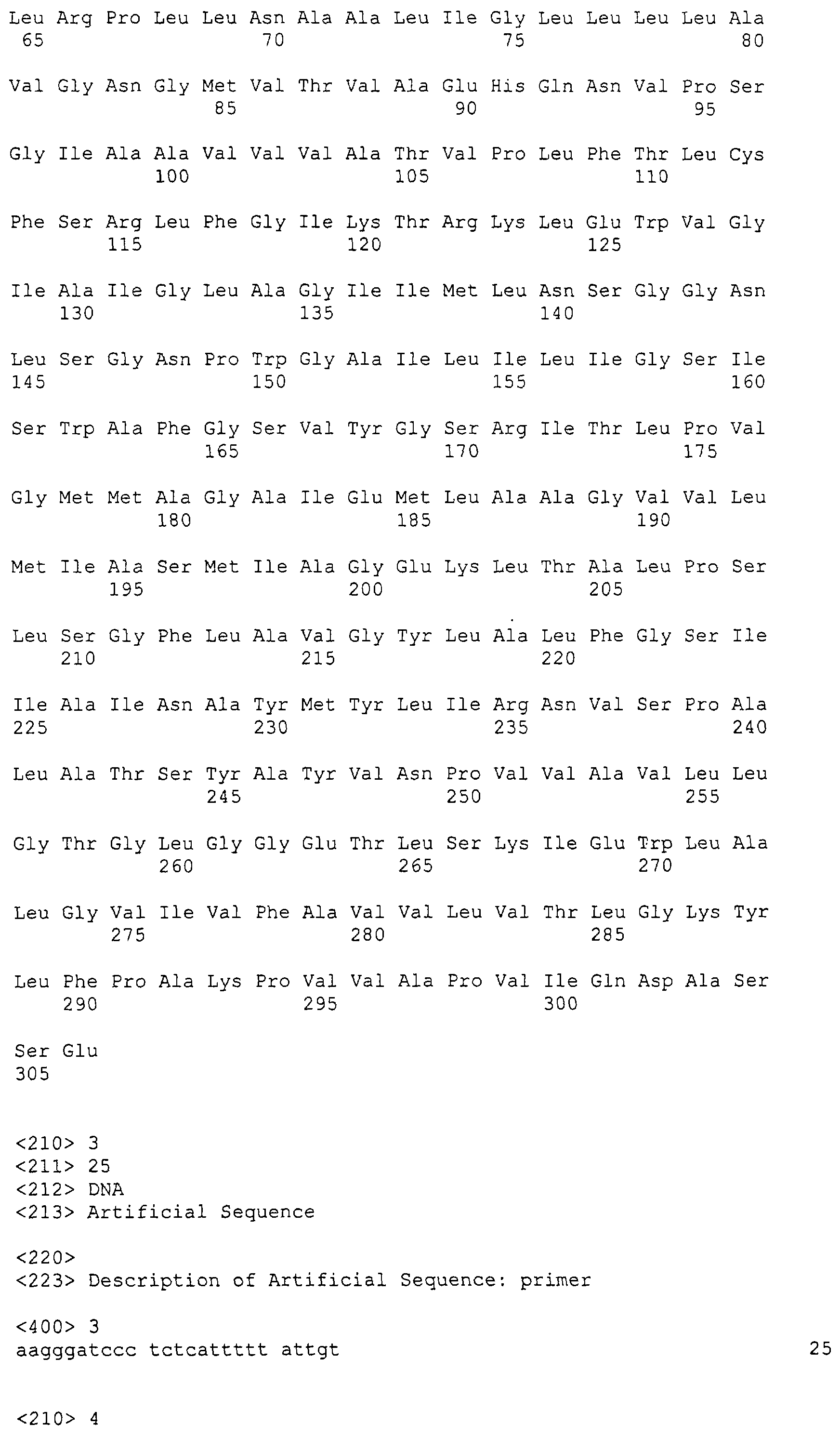 Формула изобретения 1. Способ получения L-фенилаланина или L-треонина методом ферментации, включающий стадии выращивания бактерии Escherichia coli – продуцента L-аминокислоты в питательной среде и выделения L-фенилаланина или L-треонина из культуральной жидкости, отличающийся тем, что в качестве бактерии-продуцента используют бактерию Escherichia coli, способность к продукции L-аминокислоты которой увеличена за счет увеличения активности белка, описанного в пункте (А) или (В): (А) белок, который представлен аминокислотной последовательностью, приведенной в списке последовательностей под номером 2; (В) белок, который представлен аминокислотной последовательностью, включающей делеции, замены, вставки или добавление одной или нескольких аминокислот в аминокислотную последовательность, приведенную в списке последовательностей под номером 2, и который обладает активностью, придающей бактерии устойчивость к L-аминокислотам, таким, как фенилаланин, треонин, гомосерин, цистеин или гистидин, и/или их аналогам, таким как п-фторфенилаланин, 5-фтор-DL-триптофан, S-(2-аминоэтил)цистеин или 4-аза-DL-лейцин. 2. Способ по п.1, отличающийся тем, что активность белка повышена путем трансформации бактерии с помощью ДНК, кодирующей белок, описанный в пункте (А) или (В), или путем изменения регуляции экспрессии последовательности указанной ДНК в хромосоме упомянутой бактерии. 3. Способ по п.2, отличающийся тем, что трансформация осуществляется с использованием многокопийного вектора. 4. Способ по п.1, отличающийся тем, что у упомянутой бактерии дополнительно повышена экспрессия генов биосинтеза L-фенилаланина. 5. Способ по п.1, отличающийся тем, что у упомянутой бактерии дополнительно повышена экспрессия генов треонинового оперона. 6. Штамм Escherichia coli AJ12739 (pAYCTER-YEDA2), трансформированный плазмидой, содержащей ген yedA – продуцент L-фенилаланина. 7. Штамм Escherichia coli MG442/pYEDA1, трансформированный плазмидой, содержащей ген yedA, – продуцент L-треонина. |