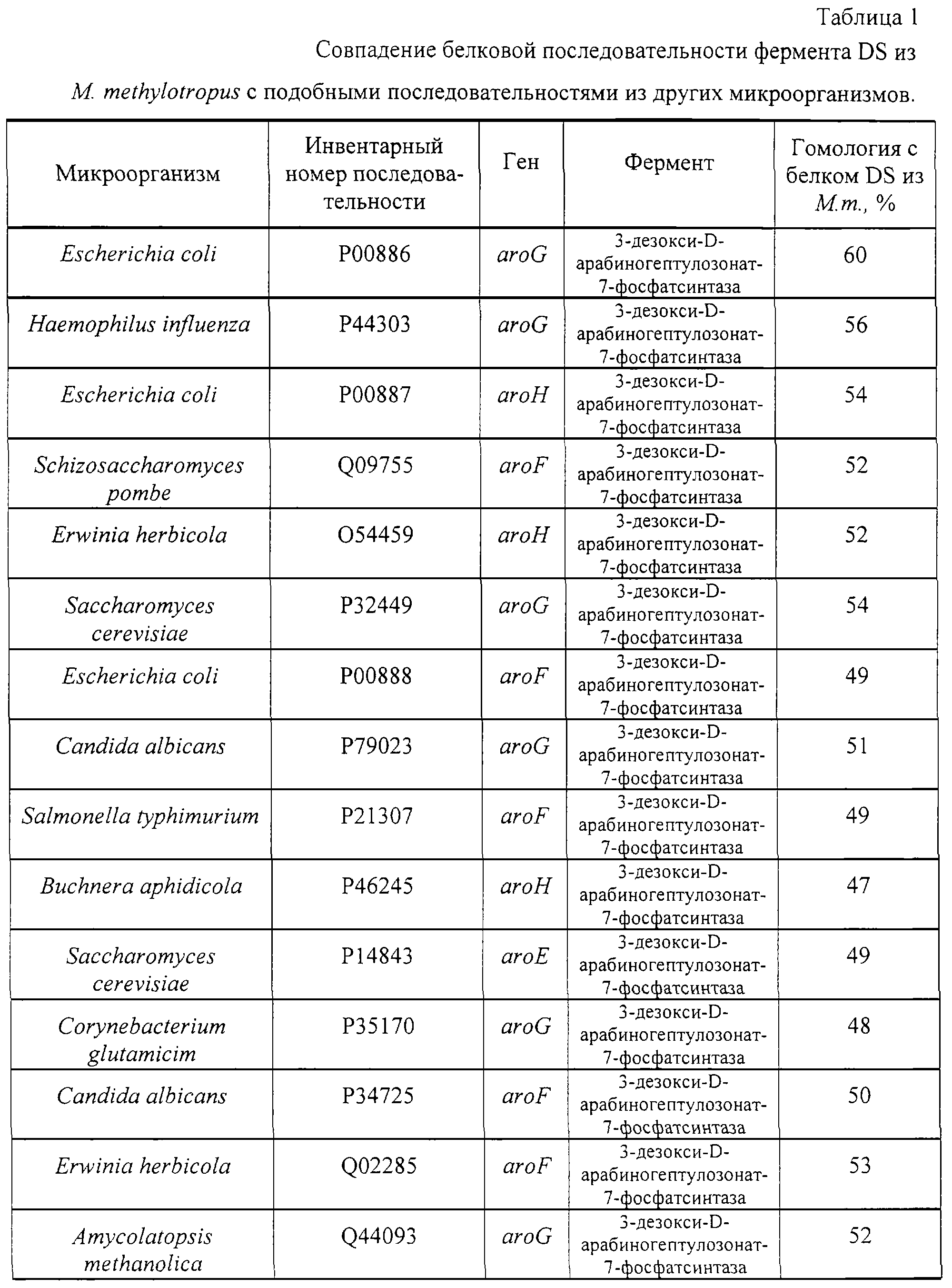 Формула изобретения 1. 3-дезокси-D-арабиногептулозонат-7-фосфатсинтаза из Methylophilus methylotrophus, содержащая последовательность аминокислот: (А) приведенную в последовательности, указанной в SEQ ID NO:2; или (В) включающую делеции, замены, вставки или добавления одной или нескольких аминокислот в аминокислотной последовательности, указанной в SEQ ID NO:2, и обладающую активностью 3-дезокси-D-арабиногептулозонат-7-фосфатсинтазы. 2. Фрагмент ДНК, кодирующий 3-дезокси-D-арабиногептулозонат-7-фосфатсинтазу по п.1, содержащий последовательность нуклеотидов, указанную в списке последовательностей под номером SEQ ID NO:1, или гибридизующийся в жестких условиях с нуклеотидной последовательностью, указанной в списке последовательностей под номером SEQ ID NO:1, или зондом, приготовленным из указанной последовательности, где жесткими являются условия, при которых отмывка происходит при 60 С, а концентрация соли соответствует 1 SSC и 0,1% SDS.