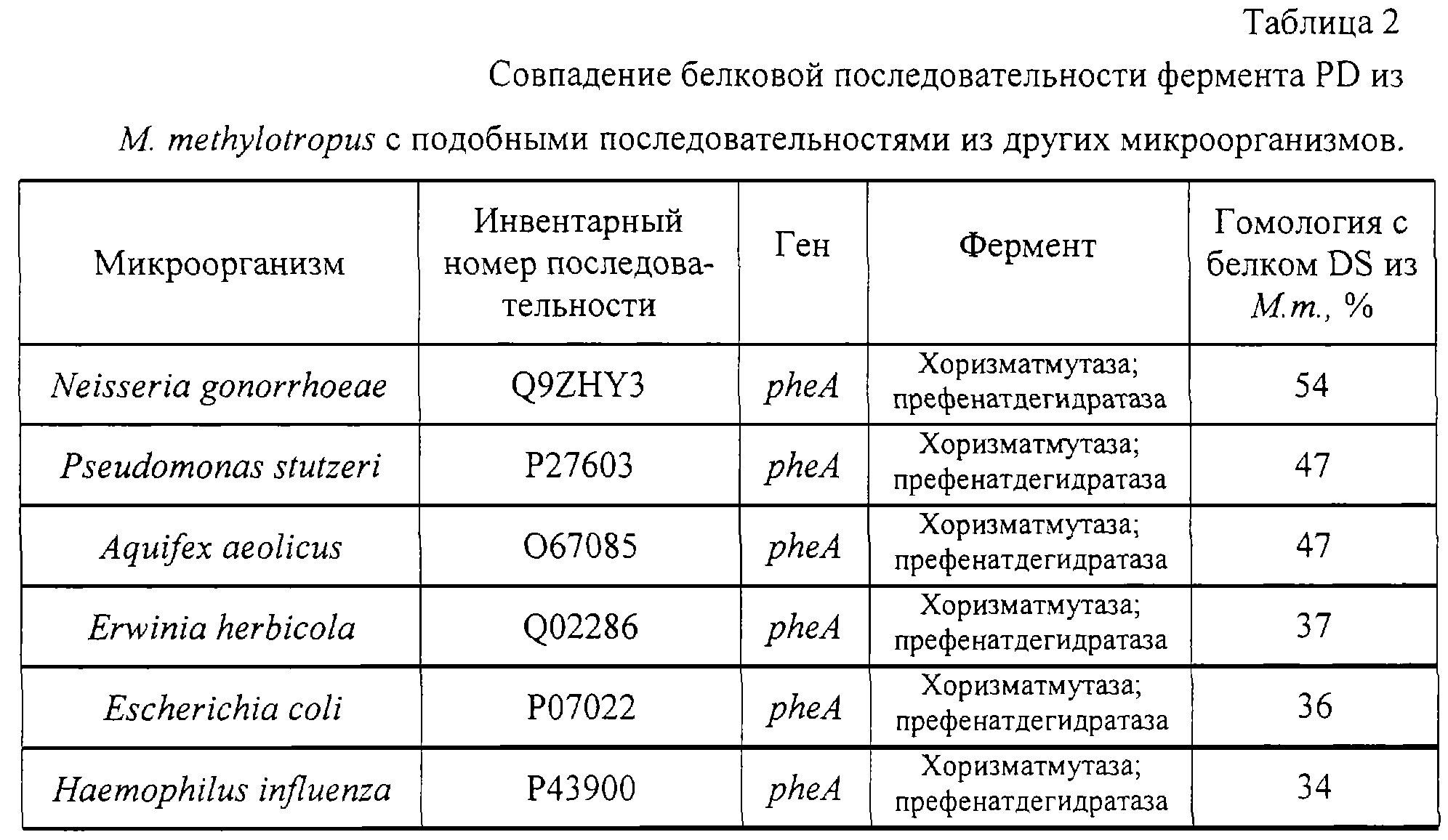 В настоящем изобретении термин “активность 3-дезокси-D-арабиногептулозонат-7-фосфатсинтазы” означает активность, которая катализирует реакцию синтеза 3-дезокси-D-арабиногептулозонат-7-фосфата из фосфоенолпирувата и D-эритроза-4-фосфата. Термин “активность префенатдегидратазы” означает активность, которая катализирует реакцию синтеза фенилпировиноградной кислоты из префеновой кислоты, термин “активность хоризматмутазы” означает активность, которая катализирует реакцию синтеза префеновой кислоты из хоризмовой кислоты. Предполагается, что PD, описанная в настоящем изобретении, обладает как активностью хоризматмутазы, так и активностью префенатдегидратазы, подобной другим микроорганизмам, таким как Escherichia coli. В настоящем изобретении термин “по крайней мере одна из активностей префенатдегидратазы или хоризматмутазы” означает одно или оба свойства, которыми обладает PD. Далее в настоящем изобретении термин “по крайней мере одна из активностей префенатдегидратазы или хоризматмутазы” может упоминаться как термин “активность PD”.