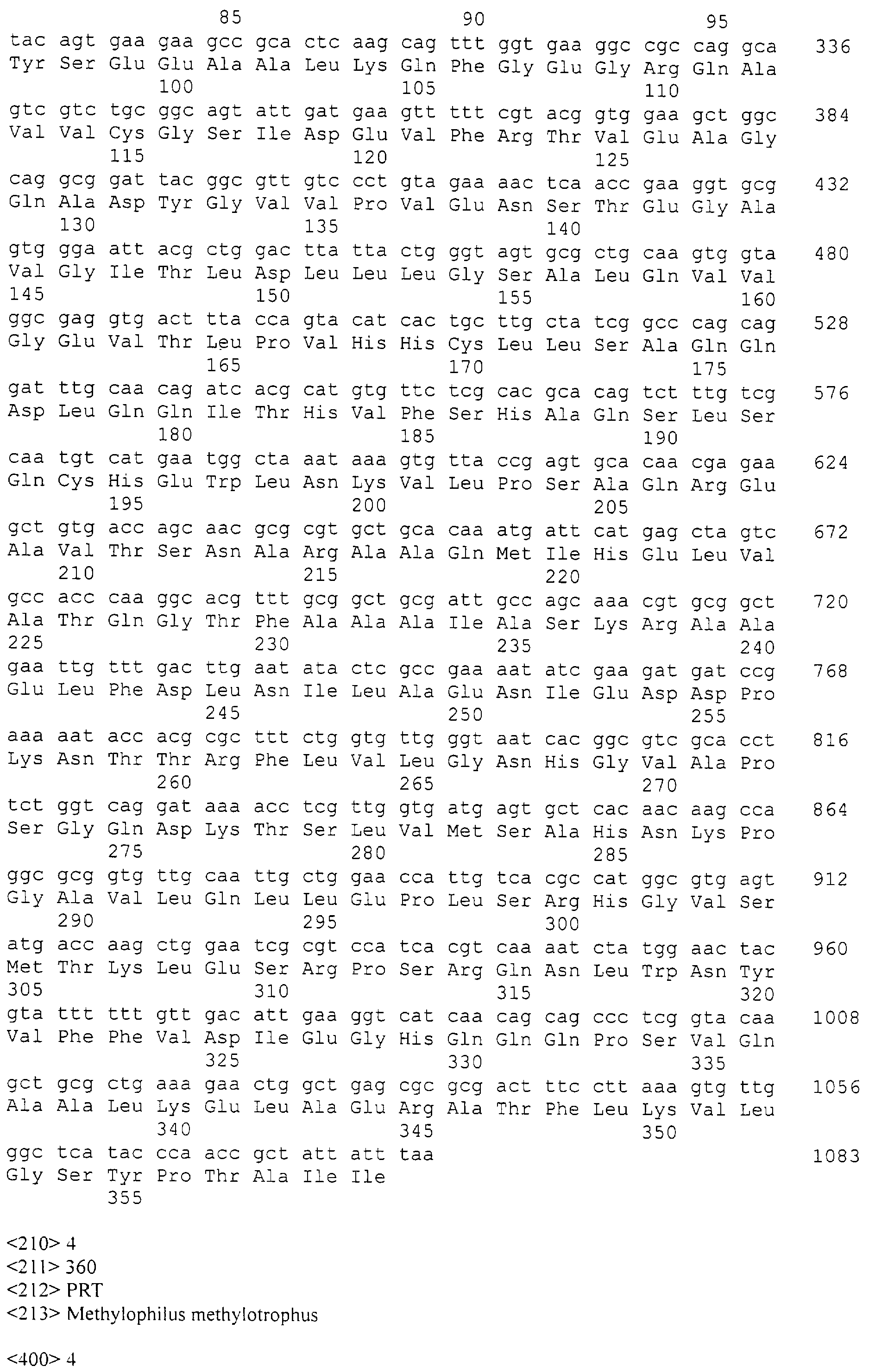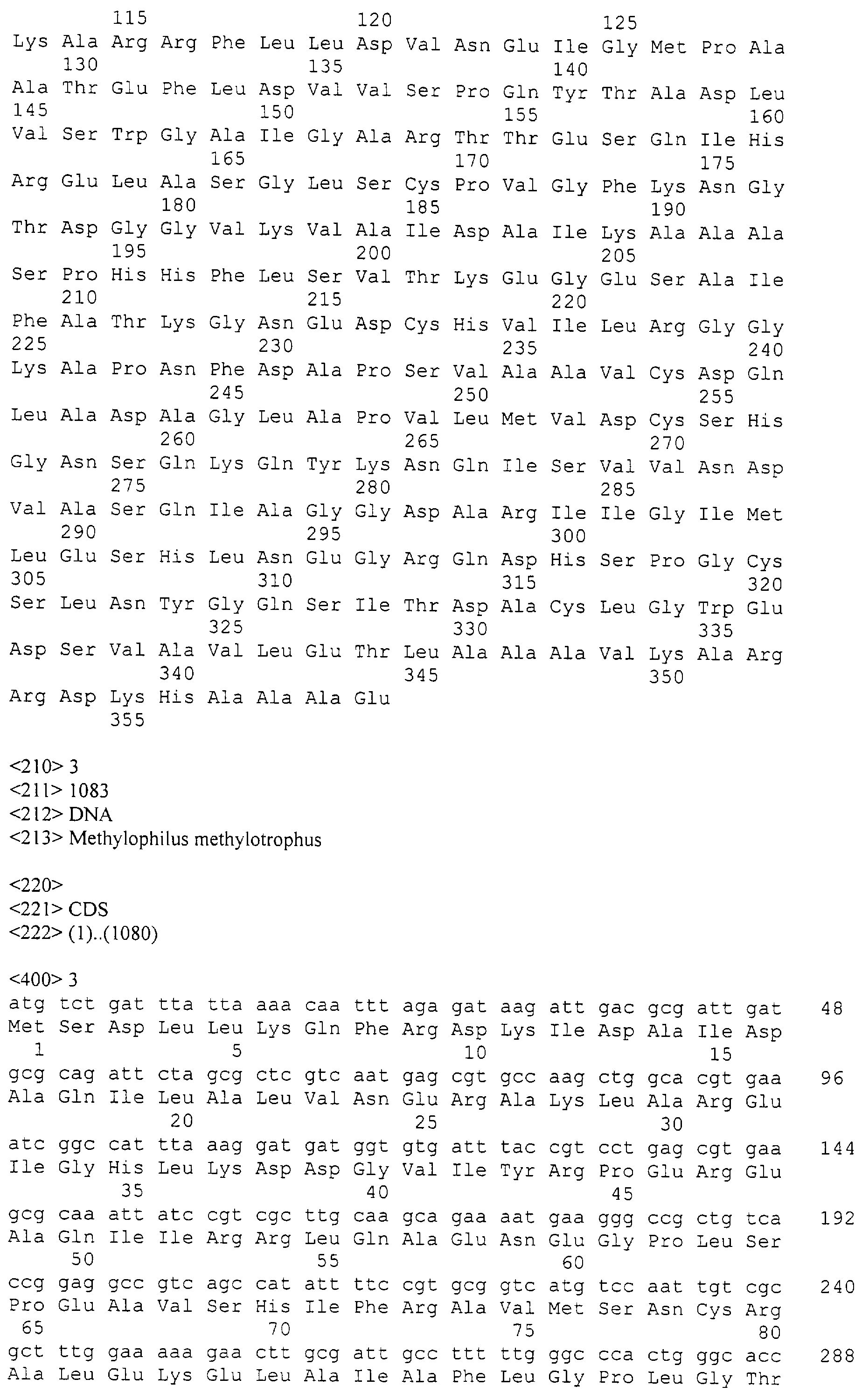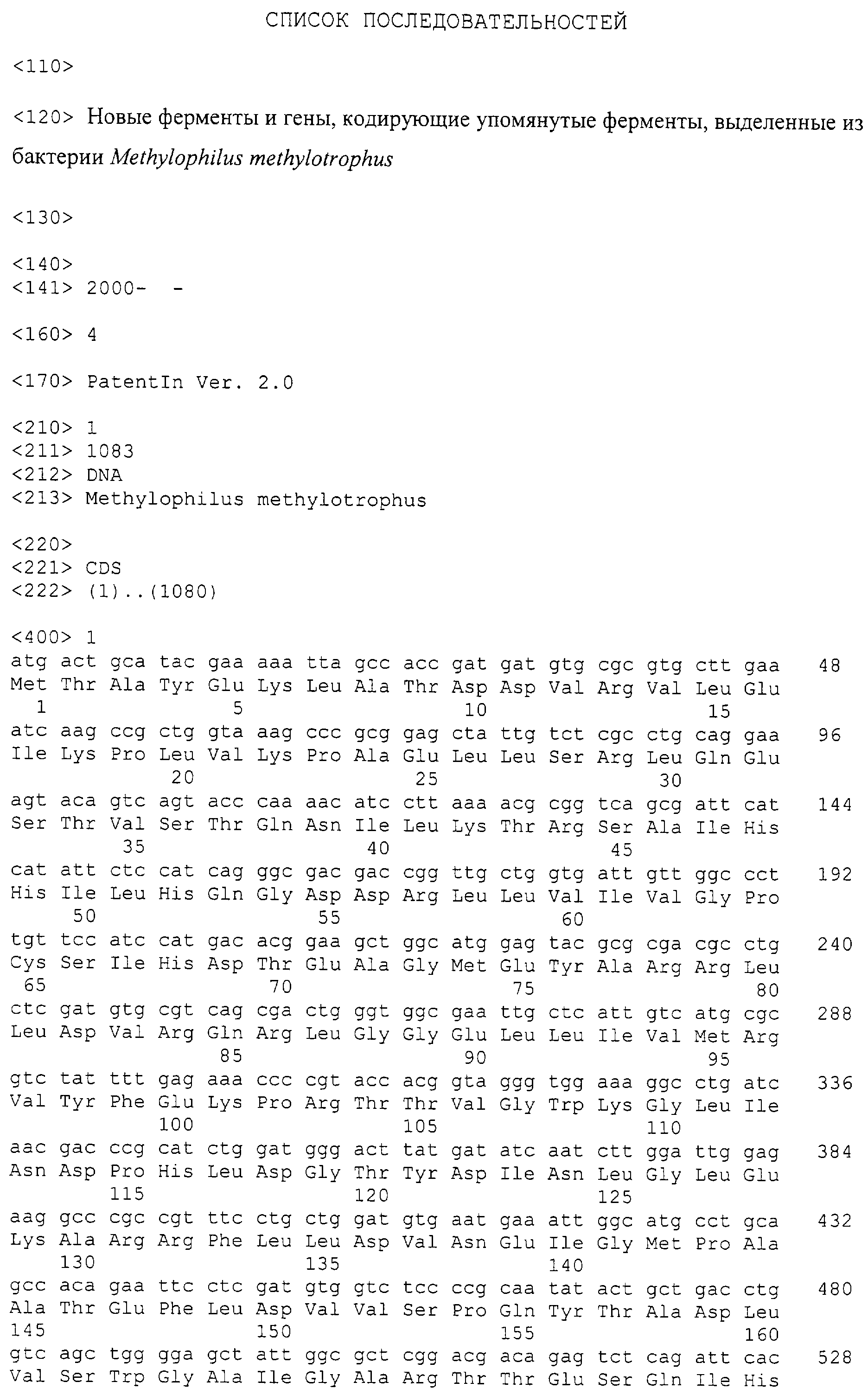 Последовательности нуклеотидов двух генов из M. methylotropus, кодирующих ферменты DS и PD, были определены. Нуклеотидная последовательность гена DS и последовательность аминокислот, кодируемая этой нуклеотидной последовательностью, показаны в SEQ ID NO:1. Нуклеотидная последовательность гена PD и последовательность аминокислот, кодируемая этой нуклеотидной последовательностью, показаны в SEQ ID NO:3.