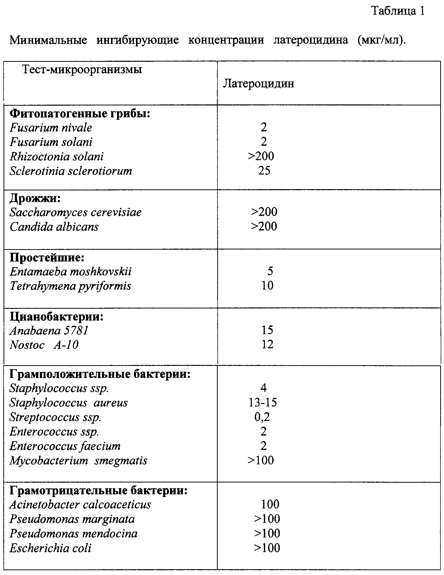 Количественную оценку антагонистического действия латероцидина проводили путем определения его минимальной ингибирующей концентрации (МИК). Для этого полученный латероцидин растворяли в минимальном объеме абсолютного этанола и готовили исходный раствор, содержащий 200 мкг/мл 5%-ного этанола. Минимальную ингибирующую концентрацию латероцидина определяли стандартным методом серийных двухкратных разведении исходного раствора антибиотика (18) против каждого тест-микроорганизма (таблица 1).