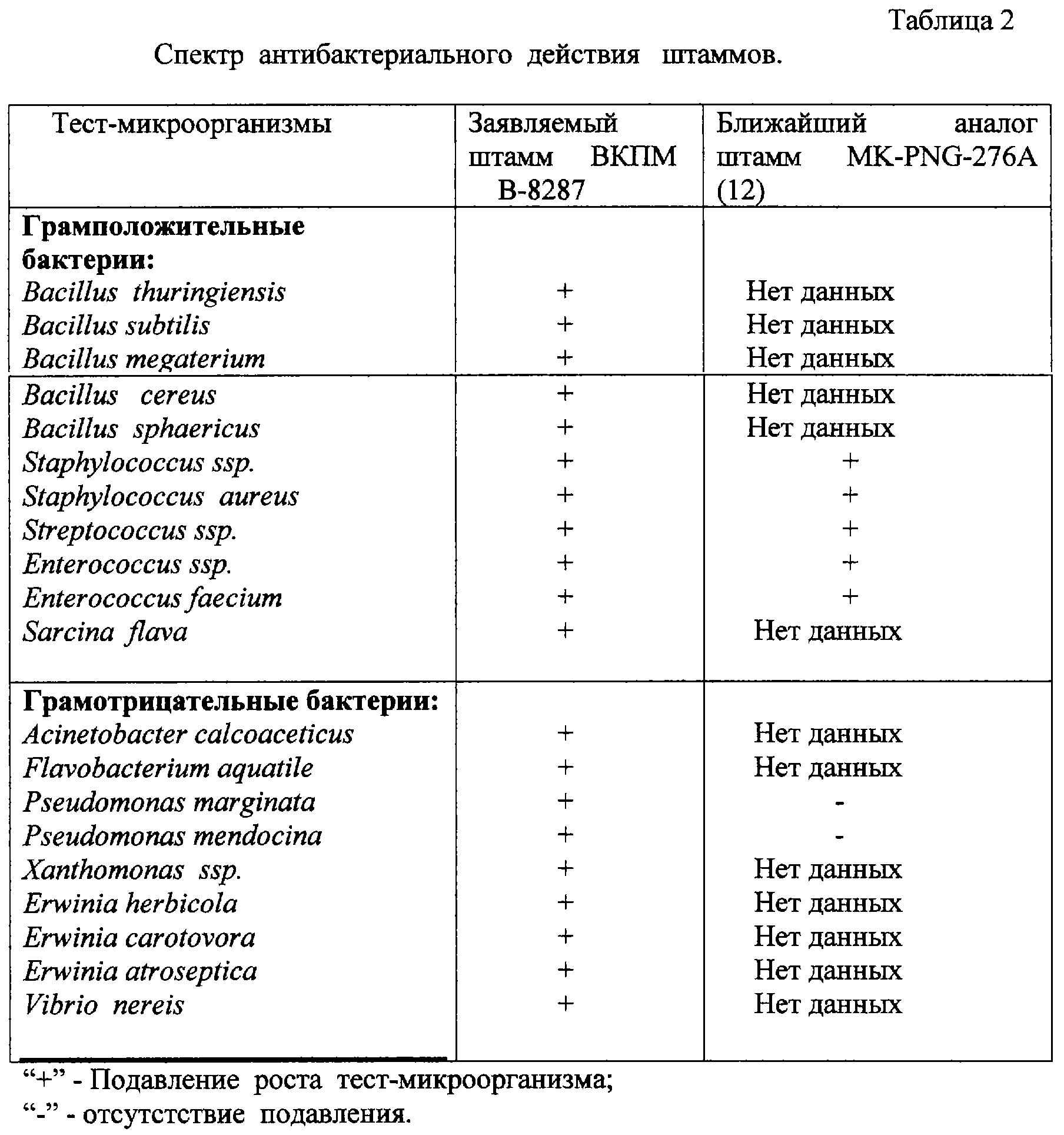 Антибактериальное действие культуры штамма выявляли методом лунок. В 25 мл агаризованной среды NBY добавляли 1 мл 4-х часовой культуры тест- бактерии, в вырезанные лунки диаметром 8 мм вносили по 50 мкл 72-часовой КЖ штамма В-8287. Чашки Петри выдерживали 2 часа при +5 С и далее инкубировали при 30 С. Антагонистическое действие штамма фиксировали через 24 часа по измерению зон ингибирования роста тест-микроорганизмов. Результаты приведены в таблице 2.