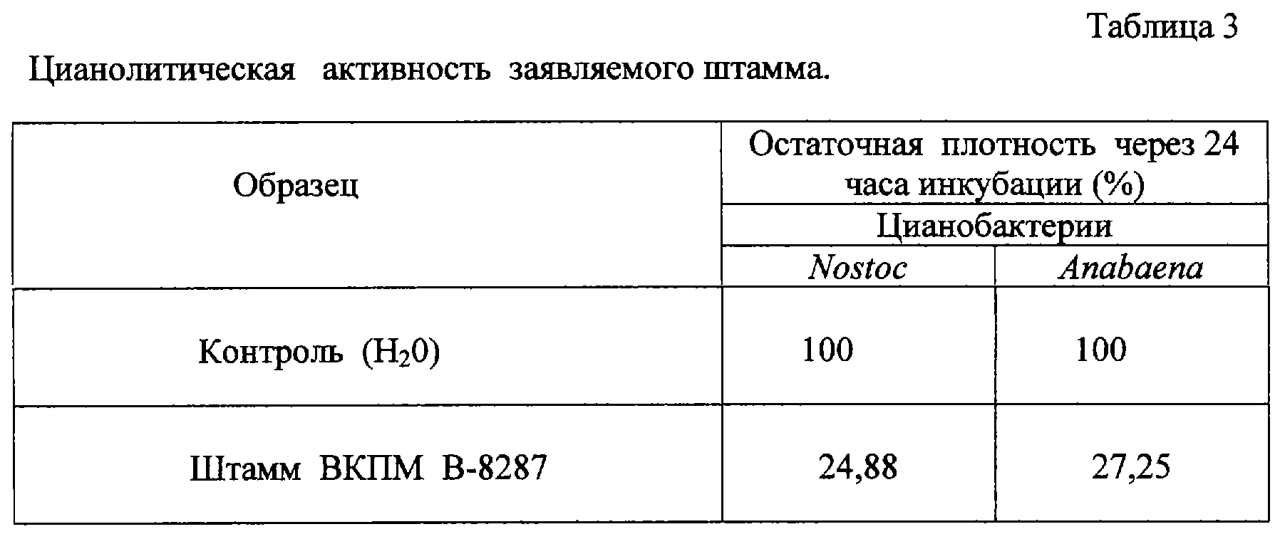 Цианолитическую активность штамма выявляли при смешанном культивировании. Культуральную жидкость 72-часовой культуры ВКПМ В-8287 вносили в суспензию 14-суточной культуры цианобактерий Nostoc ssp. 29411 или Anabaena ssp. 5781 (16). Измеряли оптическую плотность (при длине волны 590 нм) смеси в нулевой момент времени и после инкубации при 25 С и круглосуточном освещении. Цианолитическую активность оценивали по падению оптической плотности через 24 часа инкубации. Штамм ВКПМ В-8287 вызывал падение оптической плотности в 3-4 раза, что свидетельствовало о его литическом действии на цианобактерии (таблица 3). Лизис клеток цианобактерий выявлялся также при оптической микроскопии.