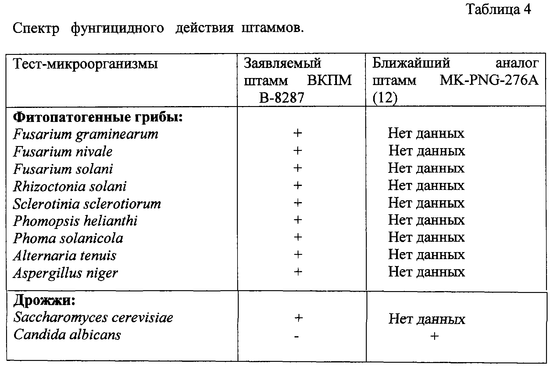 Заявляемый штамм подавлял рост мицелия следующих микроорганизмов: Fusarium graminearum, Fusarium nivale, Fusarium solani, Rhizoctonia solani, Sclerotinia sclerotiorum, Phomopsis helianthi, Phoma solanicola, Alternaria tenuis, Aspergillus niger и Saccharomyces cerevisiae, но не был активен против Candida albicans (таблица 4), в отличие от ближайшего аналога.