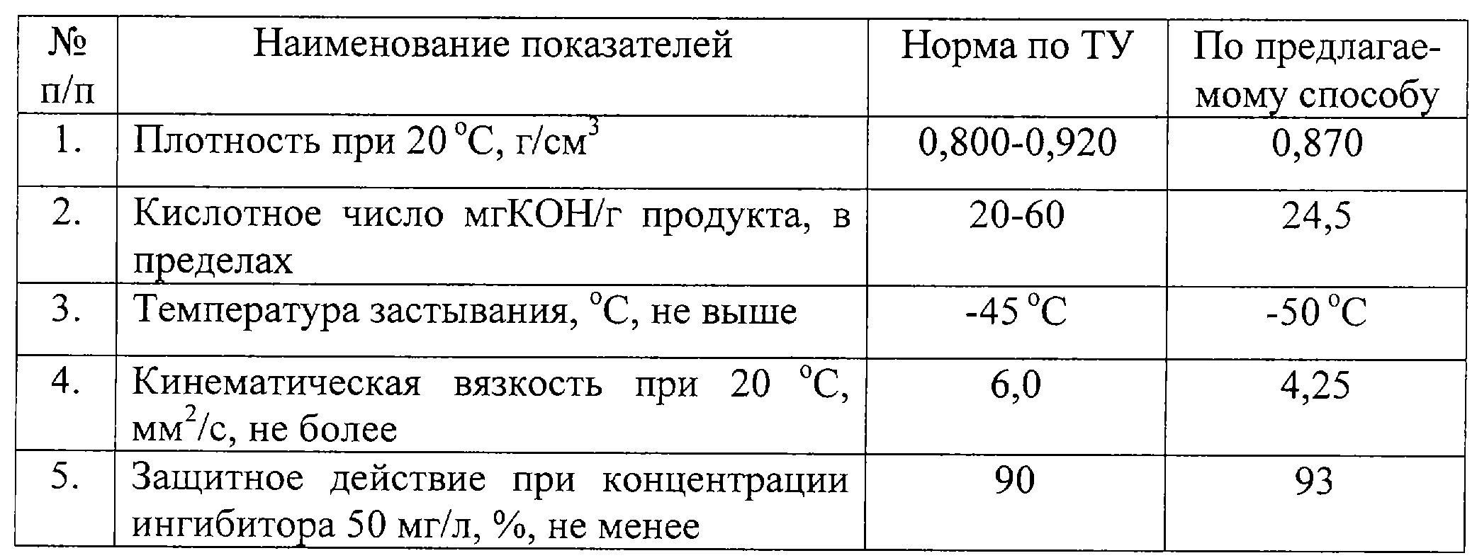 Формула изобретения Способ получения ингибитора коррозии, включающий смешение лёгких таловых масел (ЛТМ), полиэтиленполиамина (ПЭПА) и ацетона, перемешивание и конденсацию, осуществляемую в два этапа: первый – в течение 1 ч, а второй – в течение 2 ч с одновременной отгонкой воды, отличающийся тем, что первый этап конденсации проводят при температуре 95-98 С, а второй – при температуре 140-145 С, в конце которого дополнительно вводят в реакционную массу метанол и кубовый остаток бутиловых спиртов (КОБС) при содержании: метанола 45-55 мас.%, КОБСа 7-19 мас.%, отношение ЛТМ и ПЭПА в реакционной массе соответствует 6,1:1,0, ацетона – 2 мас.%.