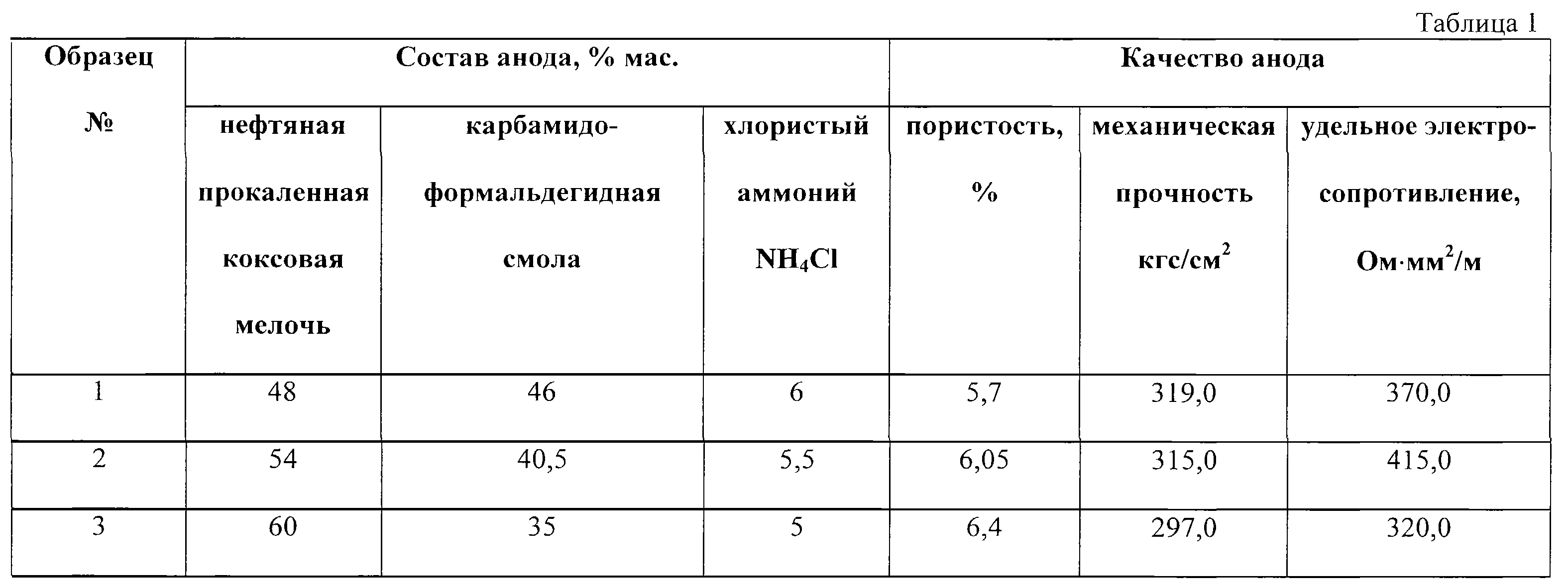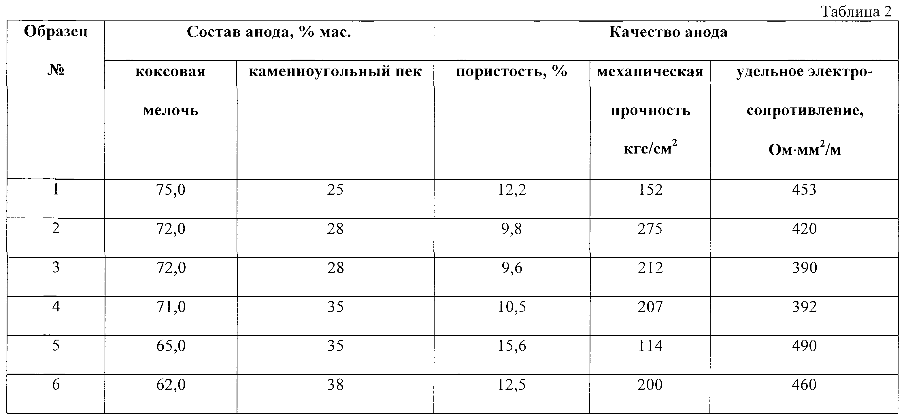 Как видно из таблицы 1, показатели готового анодного заземлителя, изготовленного на основе предлагаемого состава, выше, чем у анода, изготовленного по прототипу: механическая прочность предлагаемого состава по сравнению с прототипом на 8,5% выше, удельное электросопротивление на 7,0% ниже, чем у прототипа (см. таблицу 2).