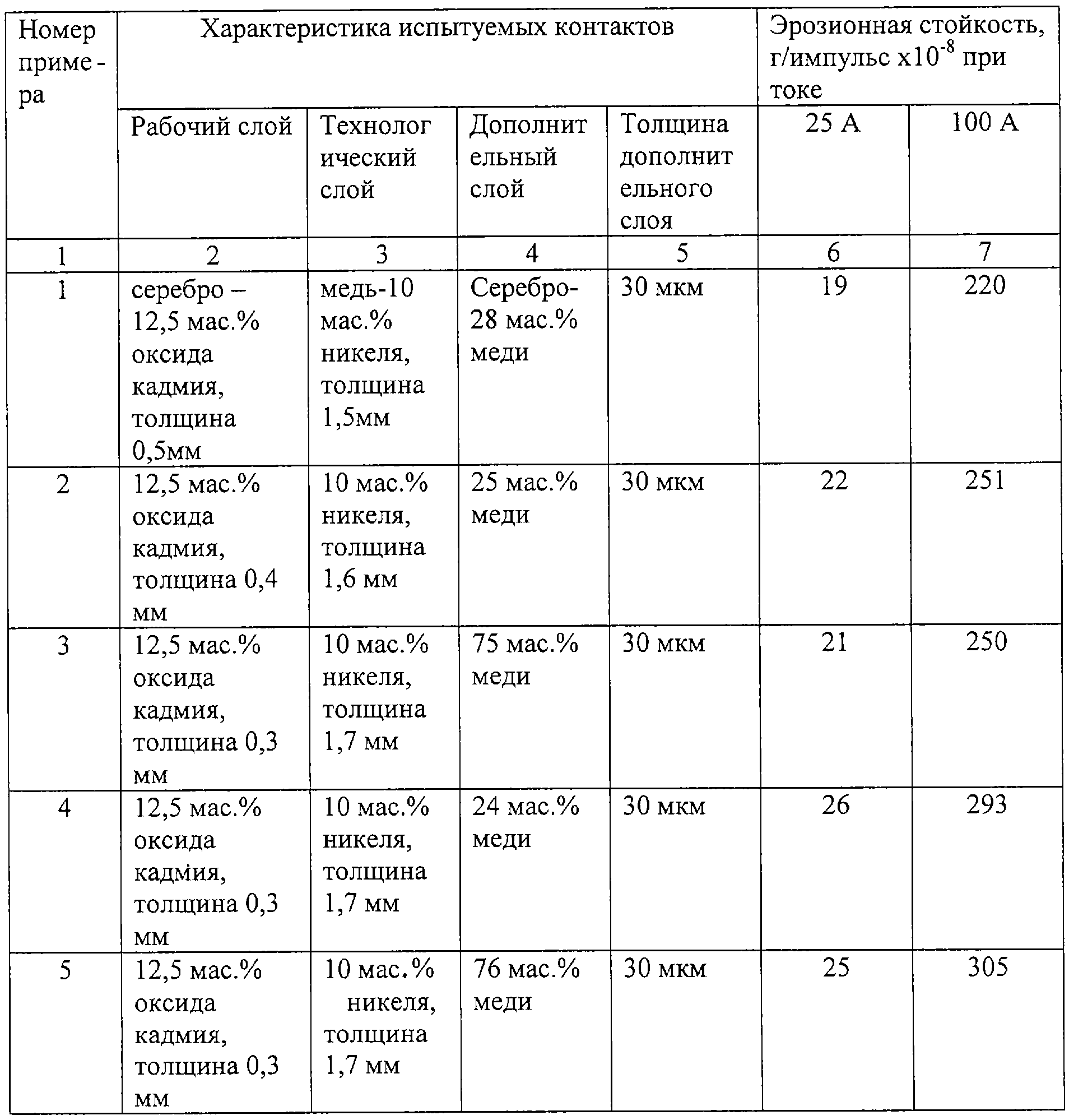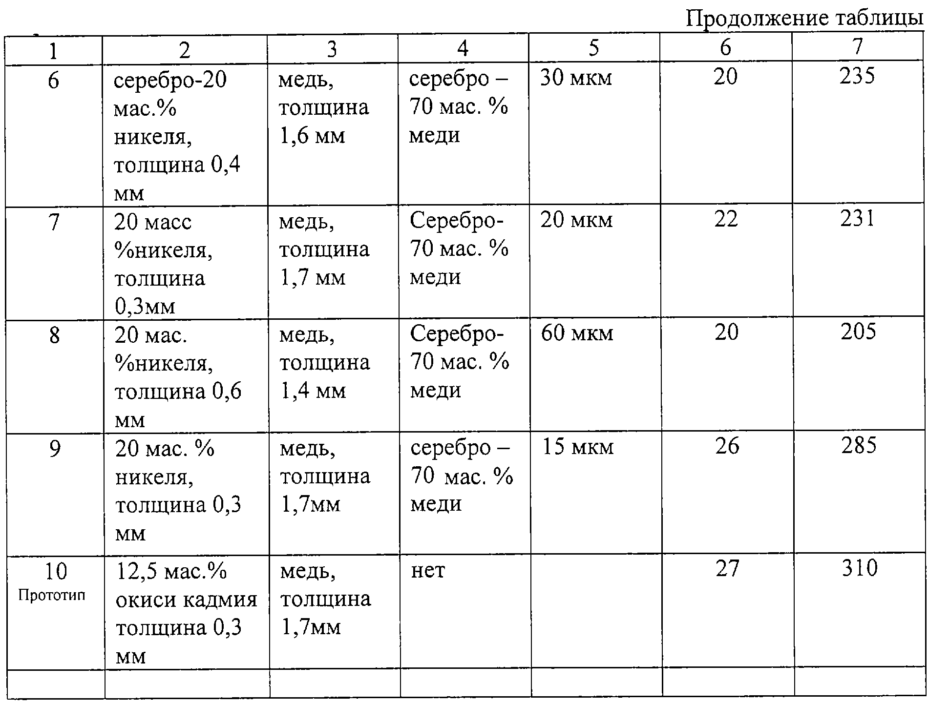 Кроме того, испытывались контакты, у которых дополнительный слой имел толщину менее заявленных в формуле 20 мкм (пример 9 таблицы), а также контакты, дополнительный слой которых содержал медь в количестве, выходящим за пределы заявленных в формуле изобретения значений (примеры 4 и 5 таблицы).