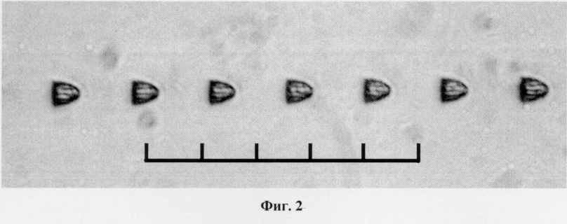 На фиг.2 представлена фотография периодической структуры пузырей в сердцевине световода (световод LEAF, Corning), образованной под действием излучения Nd:YAG лазера с длиной волны 1.06 мкм и мощностью 4.2 Вт. Излучение распространялось слева направо. Масштаб: каждое деление шкалы – 10 мкм.