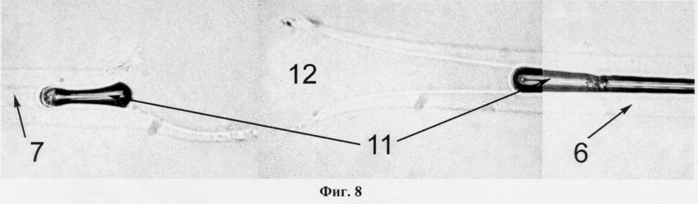 Таким образом, в волоконных линиях устанавливают, по меньшей мере, один отрезок световода с уменьшенной толщиной кварцевой оболочки 6, при этом совершенно не деформируя сердцевину 7 согласно фиг.6. Данная операция, с одной стороны, не вносит существенных искажений в канал распространения сигнала (сердцевина не деформируется), а с другой – способ изготовления таких устройств предохранения прост: можно простым химическим травлением уменьшить диаметр оболочки световода.