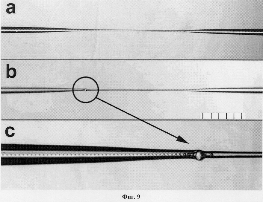 Слева от точки остановки (на фиг.9b обозначена кружком) наблюдается тот же характер разрушения световода, как и световода с нормальным диаметром кварцевой оболочки – периодическая последовательность пустот в сердцевине световода. Незадолго до точки остановки размеры пустот увеличиваются, и процесс распространения оптического разряда прекращается. Причем остановка распространения разряда сопровождается или расширением участка световода (фиг.9b, с), или разрушением световода в точке остановки (фиг.8).