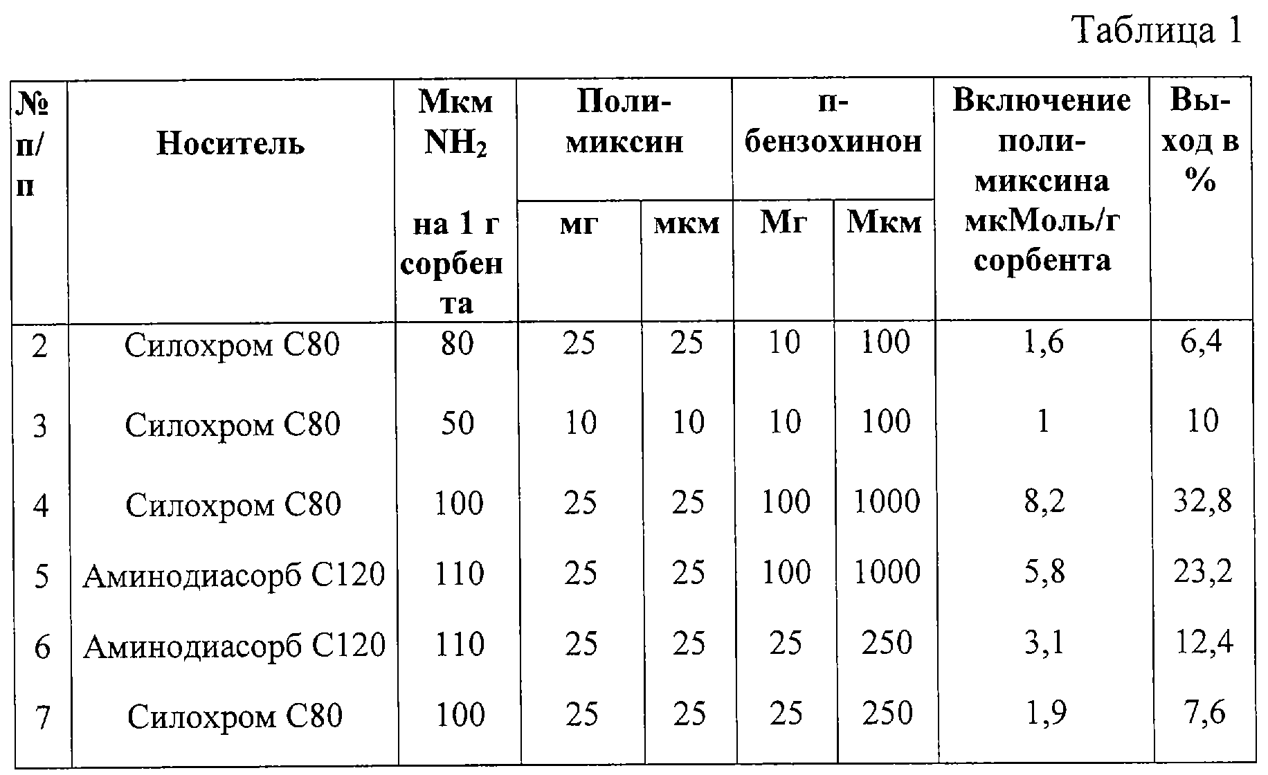 Содержание полимиксина 1-8,2 мкМ/г, выход 6-33%. Для определения включения антибиотика в сорбент навеску 20 г гидролизуют 5,7 н НСl 48 час при 105°С и измеряют количественное содержание аминокислот на аминокислотном анализаторе.