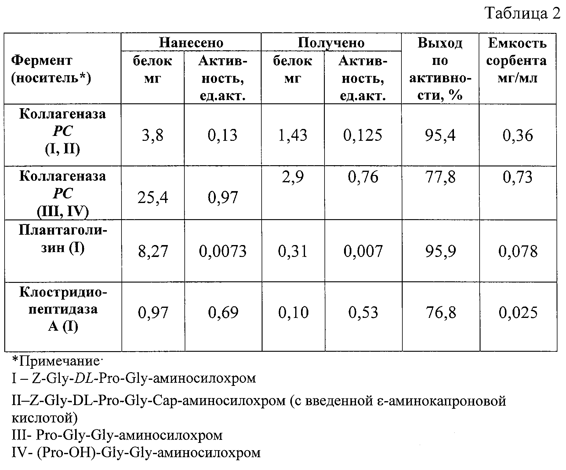 В таблице 2 приведены данные сорбции коллагеназ на афинных сорбентах, в частности, полученных в примерах 8-10.