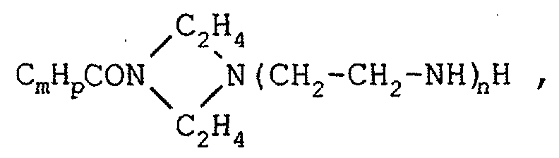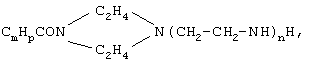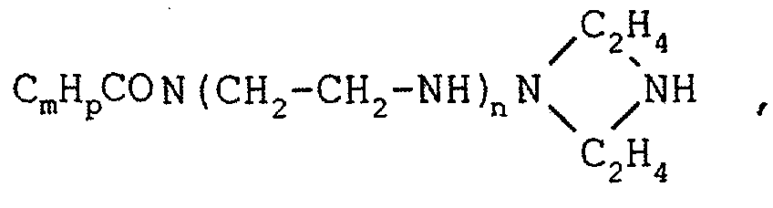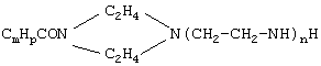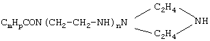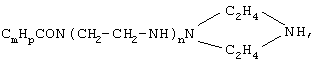 В качестве исходных кислот используют высшие насыщенные (лауриновая, стеариновая и т.п.) или ненасыщенные кислоты (олеиновая, пальмитиновая), либо их смеси, либо кислоты, полученные из природного сырья (продукты переработки лесохимической, маслобойной, мясной промышленности), или из синтетического сырья (синтетические жирные кислоты фракций 10-С16, C16-C22 и т.п.). В качестве полиэтиленполиаминов используются полиэтиленполиамины линейного и циклического строения, содержащие в своем составе не менее 90% соединений, содержащих не менее 4 атомов азота. Могут использоваться как индивидуальные продукты – триэтилентетрамин (ТЭТА), тетраэтиленпентамин (ТЭПА) и т.п., так и смеси высших полиэтиленполиаминов (ПЭПА). Мольное соотношение карбоновых кислот и полиэтиленполиаминов при синтезе должно быть (0,8-1,3) к 1.